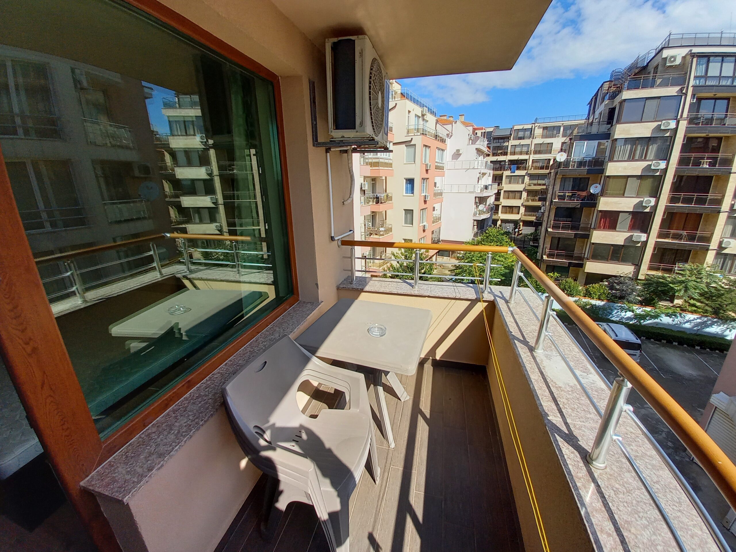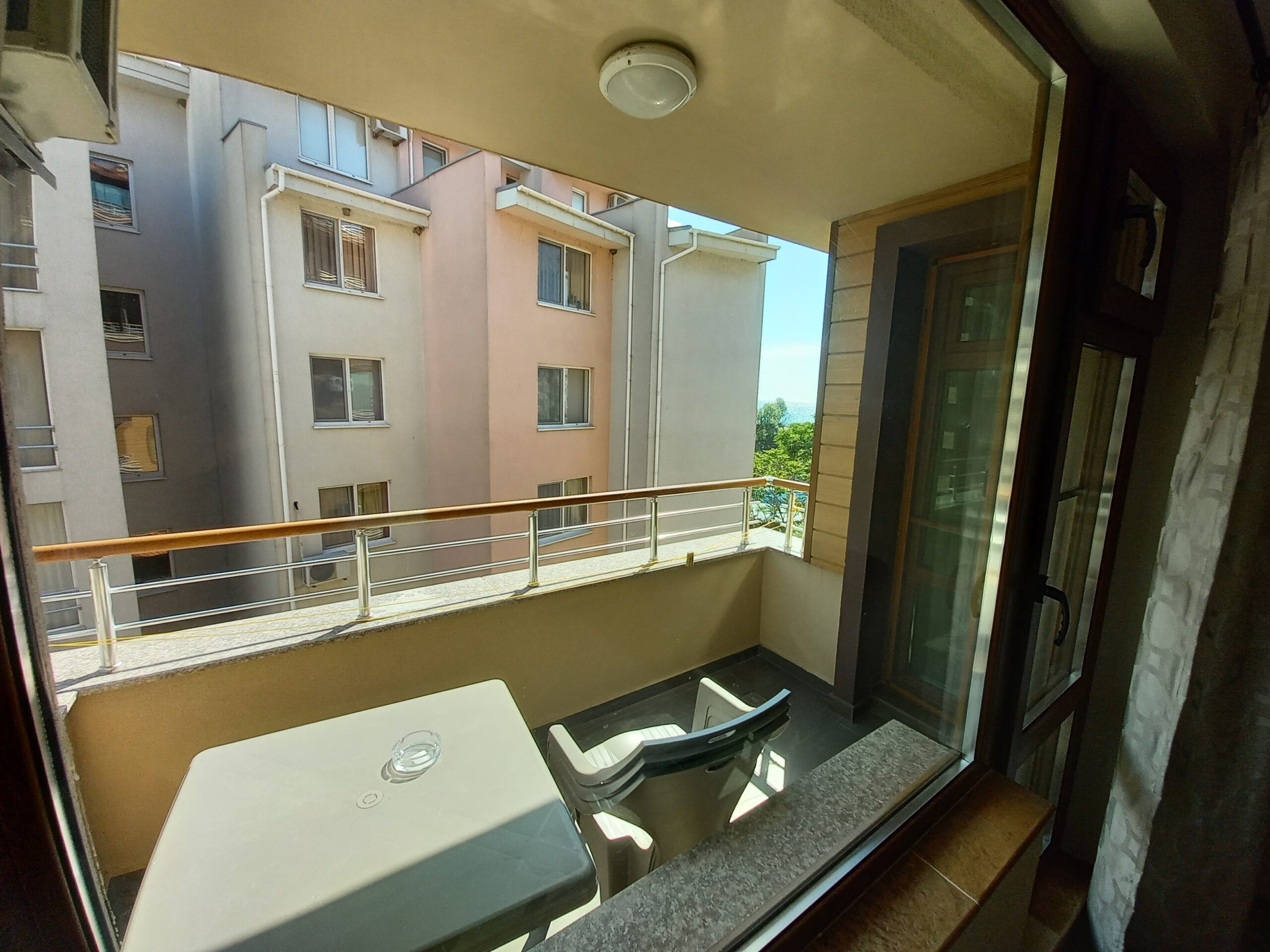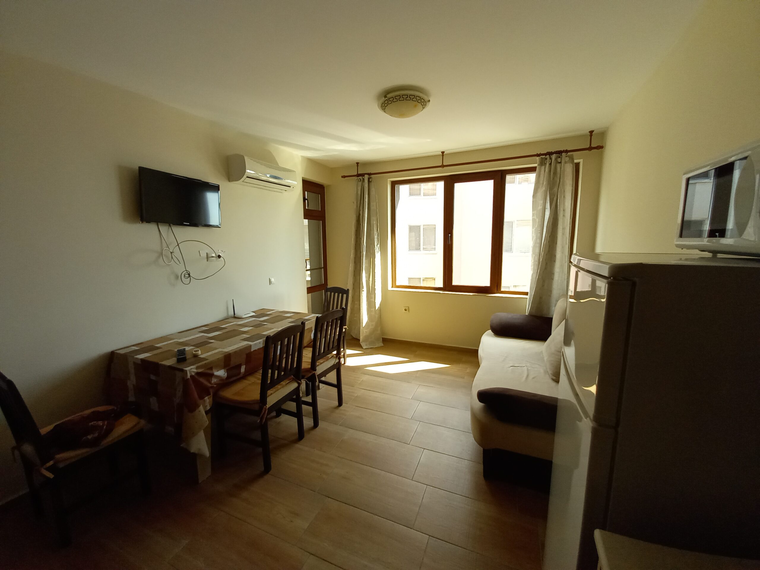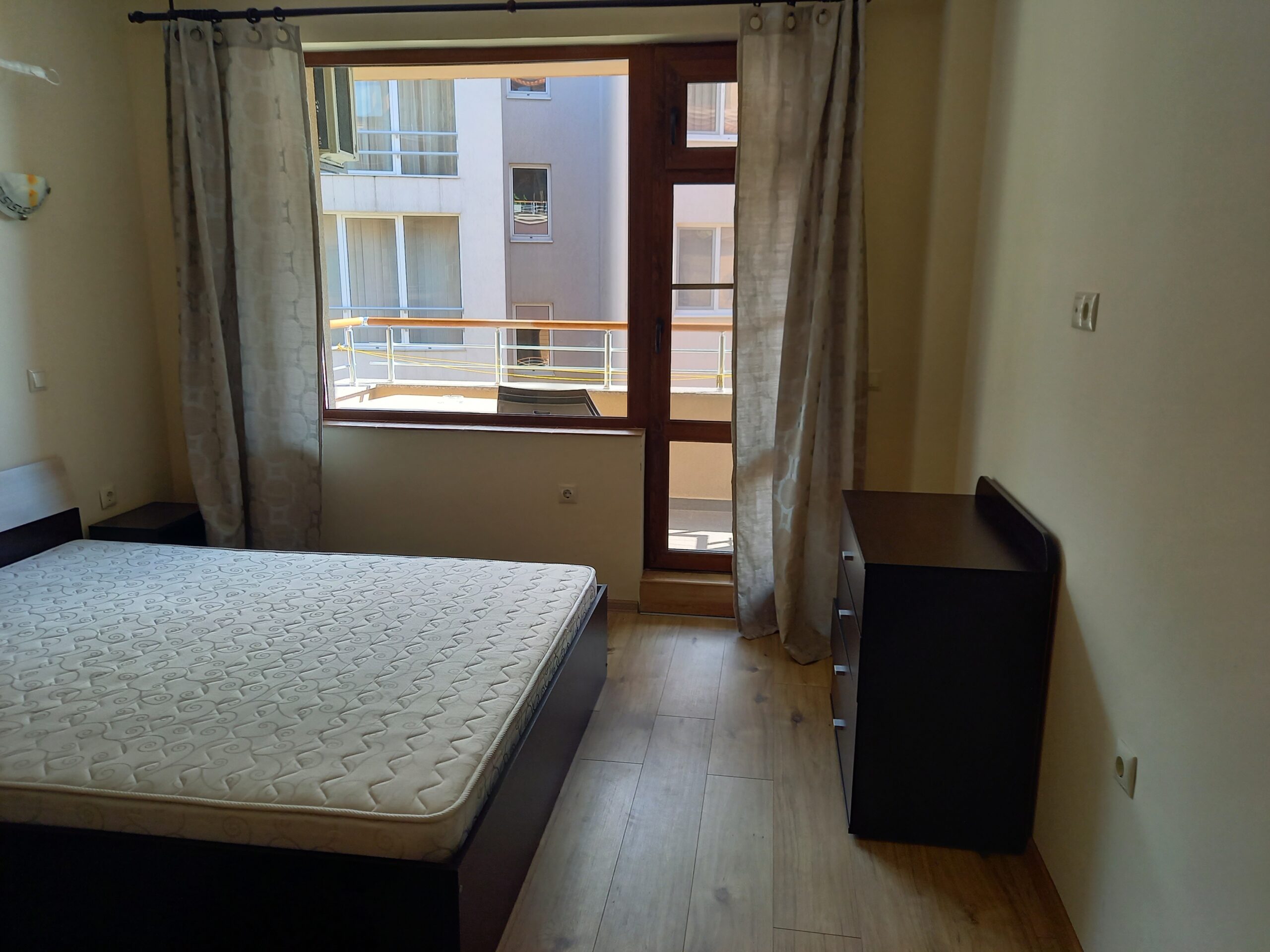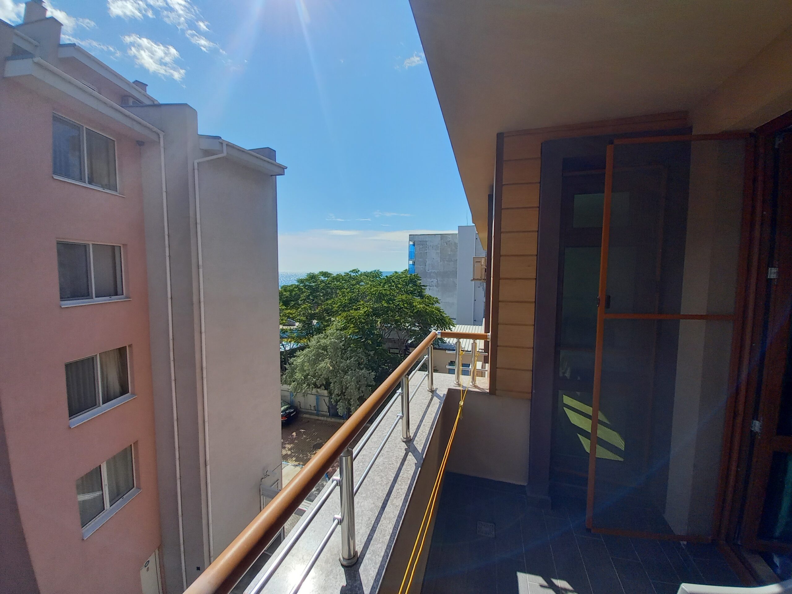 Двустаен апартамент на ул. Европа №3 в близост до базата на „Софарма“. Апартамента е разположен на 4-ти етаж с североизточно изложение, разполага с всекидневна оборудвана с кухня, кът за хранене и разтегателен диван, спалня – с двойно легло, коридор, санитарен възел и широк балкон. В близост до сградата има бистро множество магазинчета, няколко ресторанта. Дистанцията до плажа е само 80 метра, автогарата е на около 300 метра а центъра на града окло 400 метра, локацията е много добра.