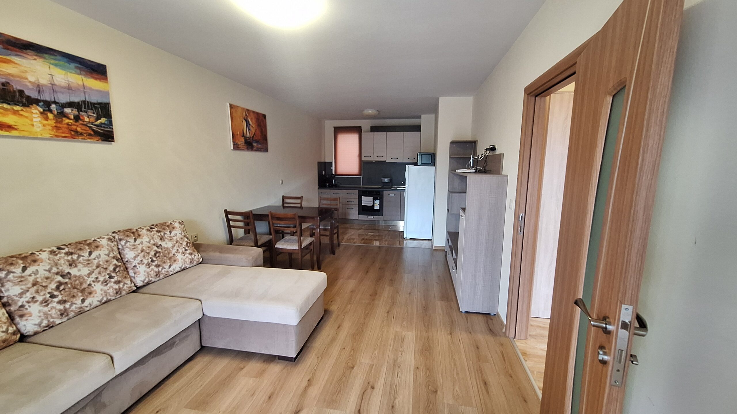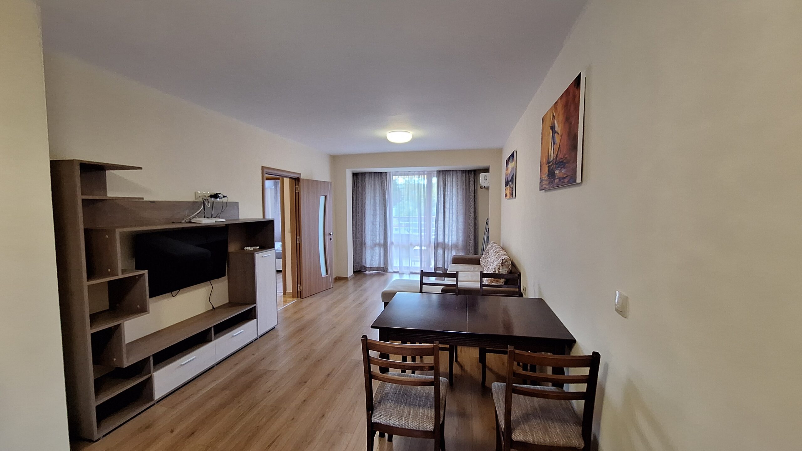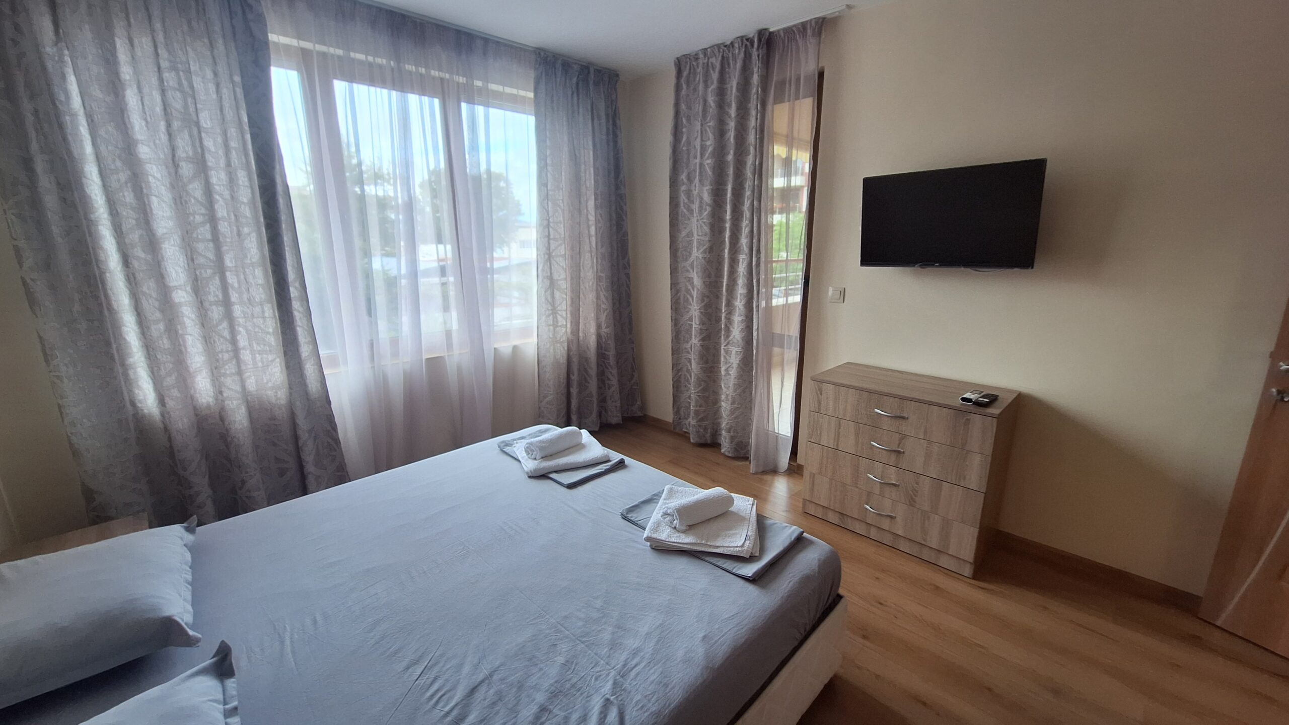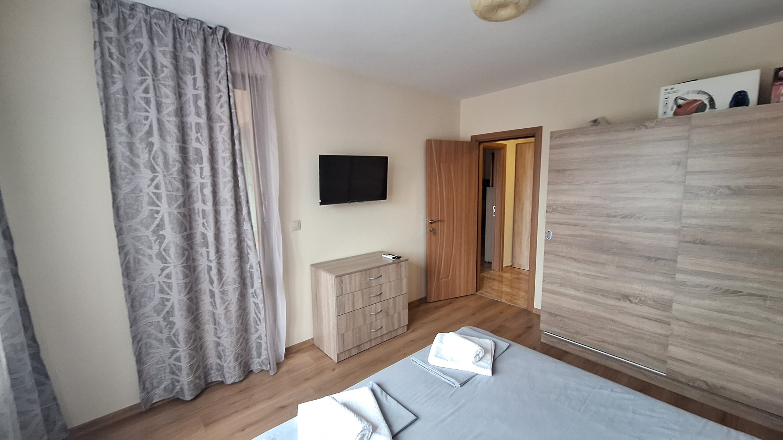 Просторен двустаен апартамент в нова сграда на 50 метра от Санаториума за Калолечение на ул. Велека №7. Апартамента е разположен на 1-ви жилищен етаж с югозапдно изложение, разполага с просторен хол – всекидневна, коридор, спалня санитарен възел и балкон. Напълно оборудван със всичко необходимо за приятен и удобен престой за вашата почивка. Имота се намира на около 5 минути от плажа, на окло 700 метра от центъра на града, до сградата има бистро няколко магазина, пазар за плодове и зеленчуци.