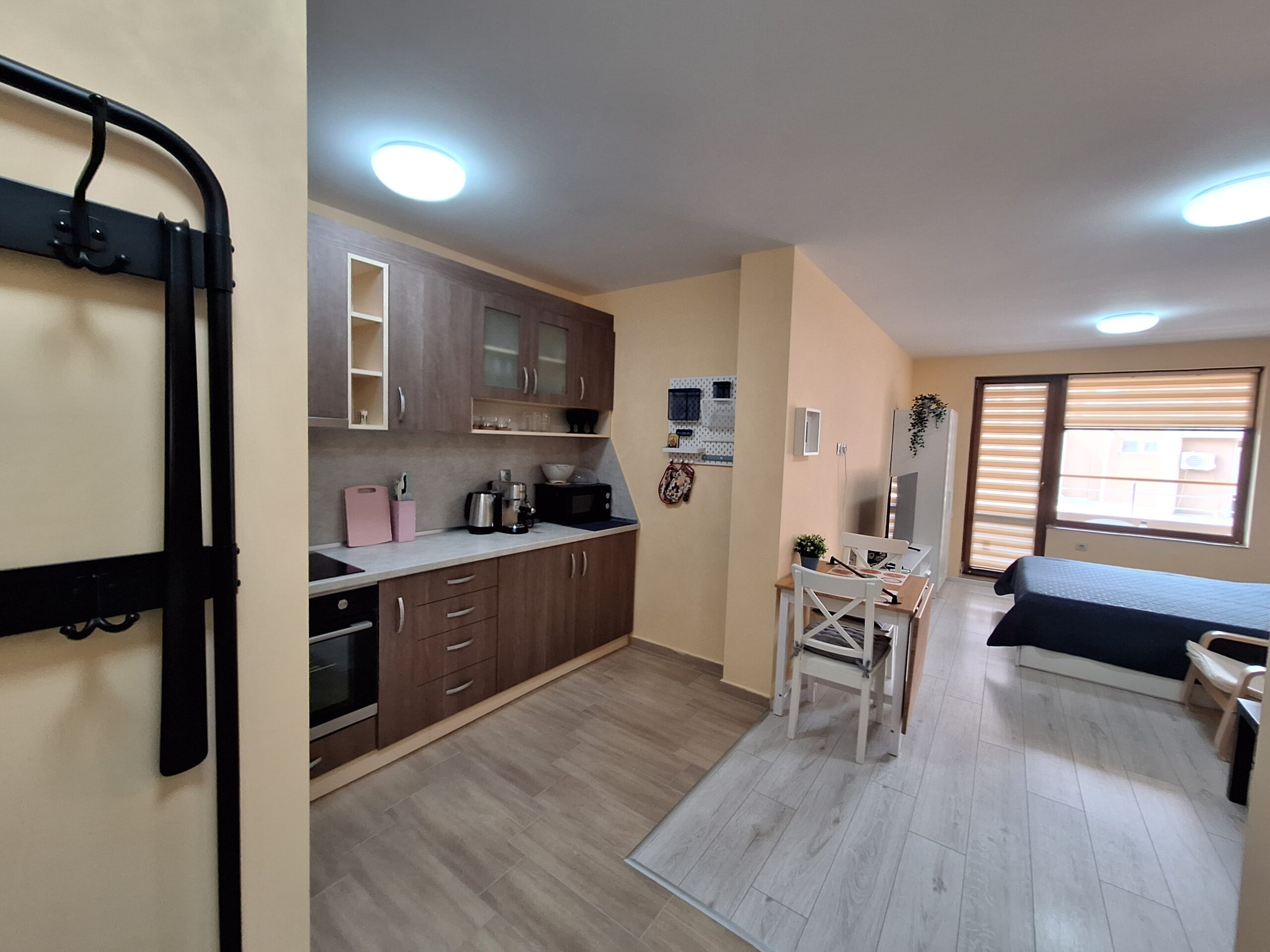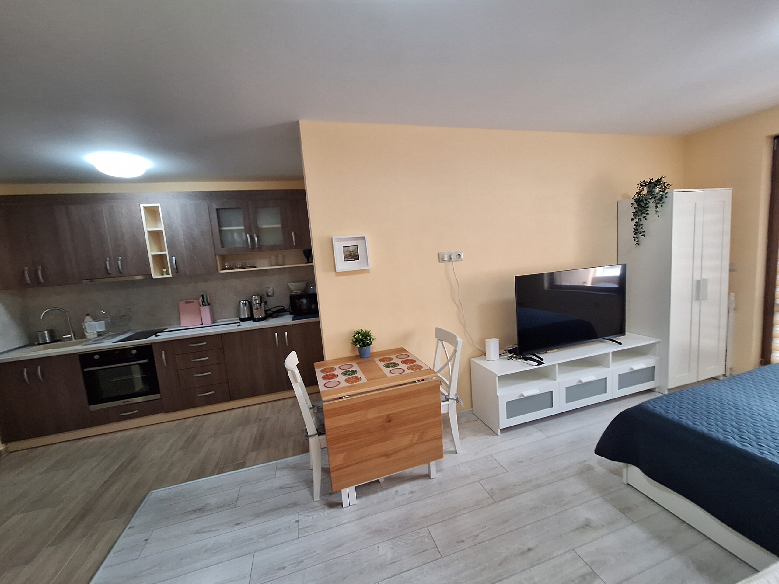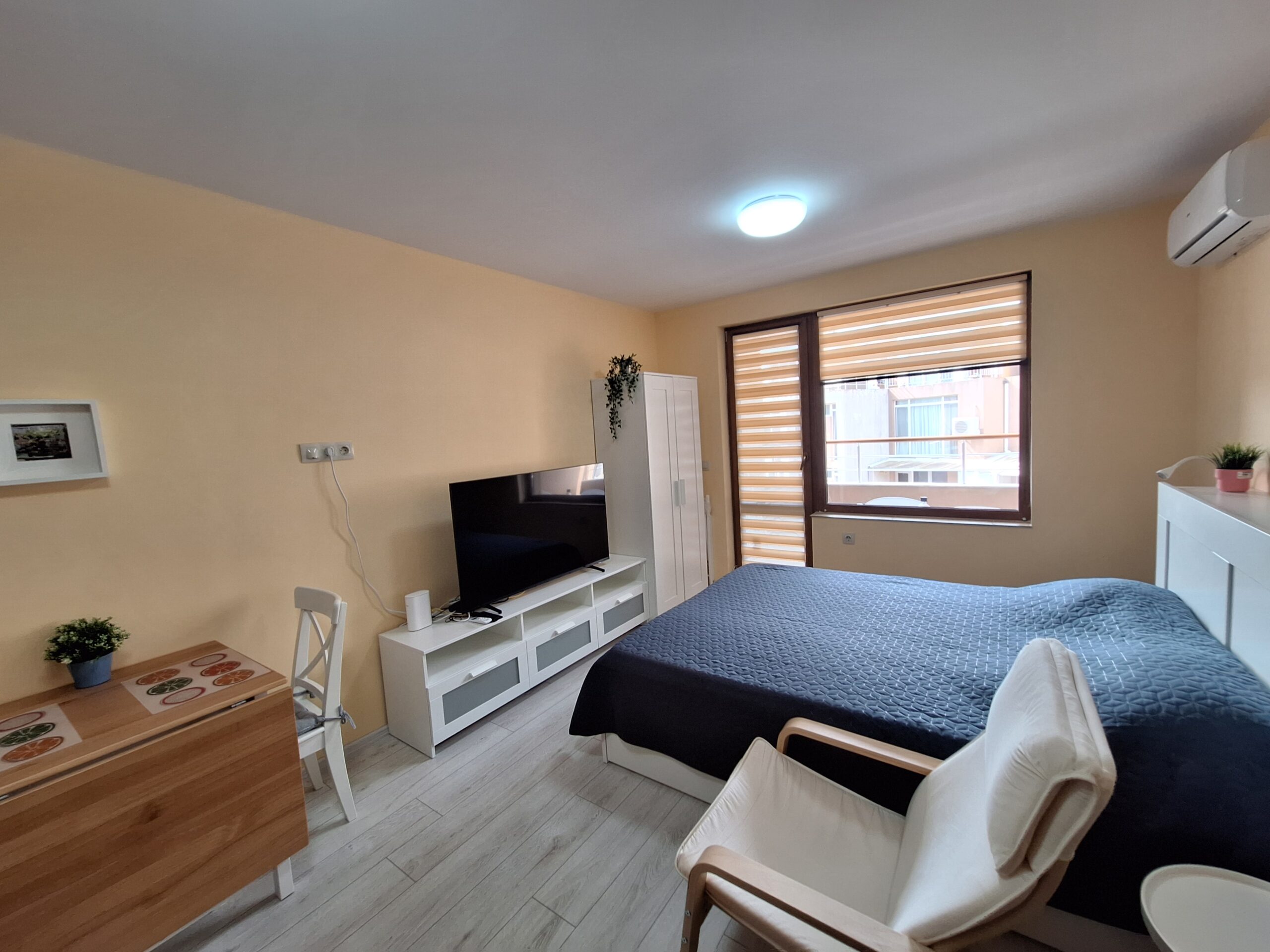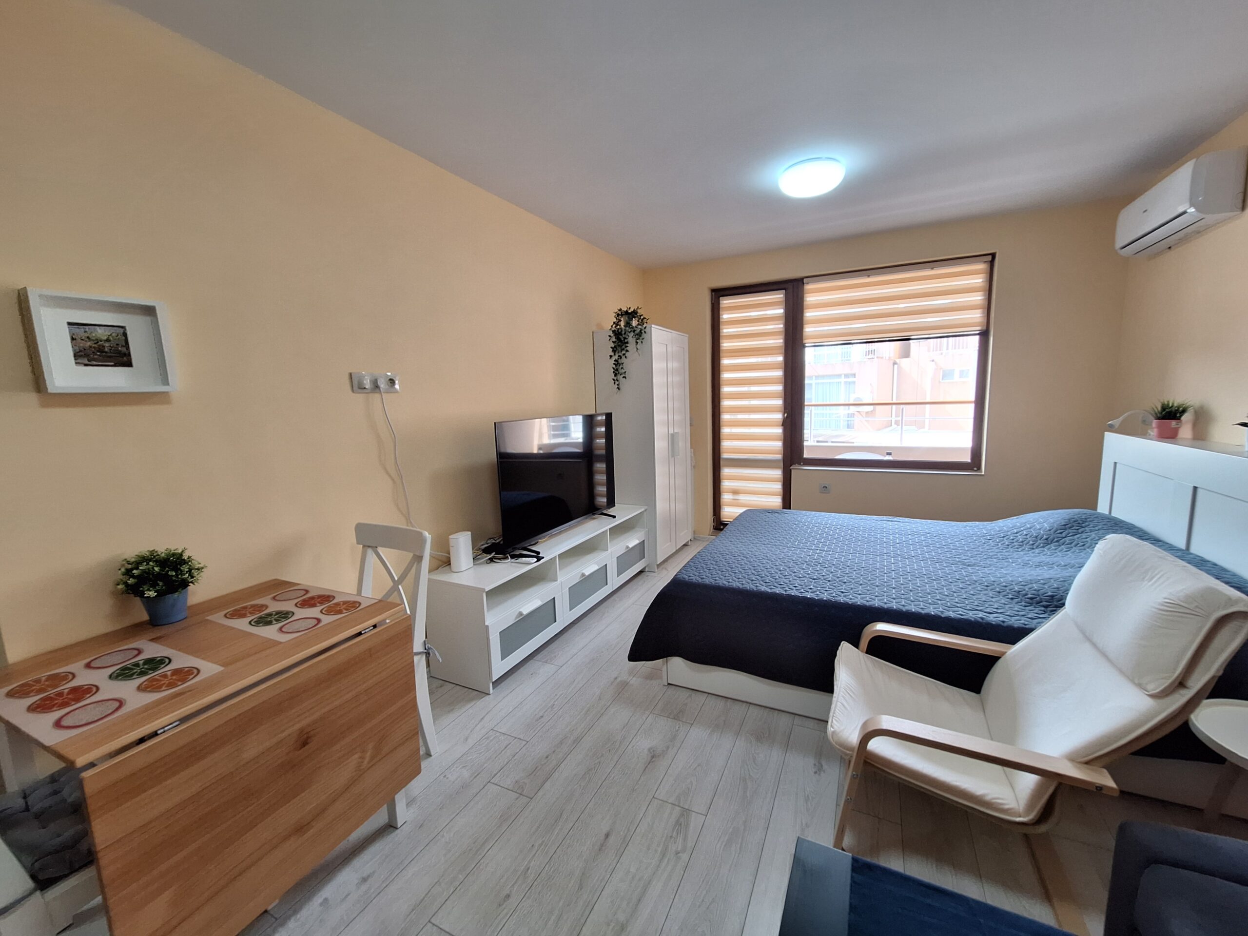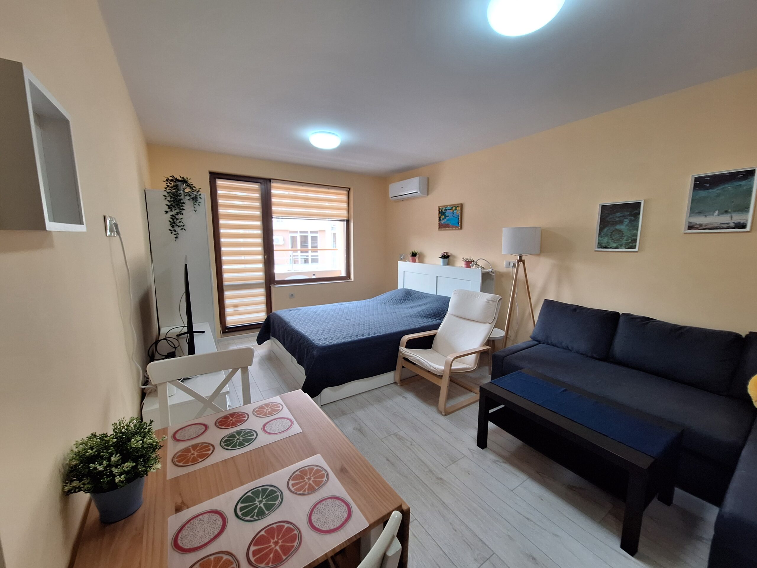 Студиото предлага всички удобства за вашият конфорт и приятно изкарване на лятната почивка. Оборудвано е скухня, която предлага двоен котло, фурна, кафе машина, чайник, микровълнова печка, тостер, пълен комплект от готварски принадлежност и посуда, хладилник с фризер. Имота е разположен на 4-ти жилищен етаж с юго-зточно изложение, просторен балкон, двойно легло и разтегателен диван. Предлага три спални места, най удобно е за 2-ма възрастни и дете.