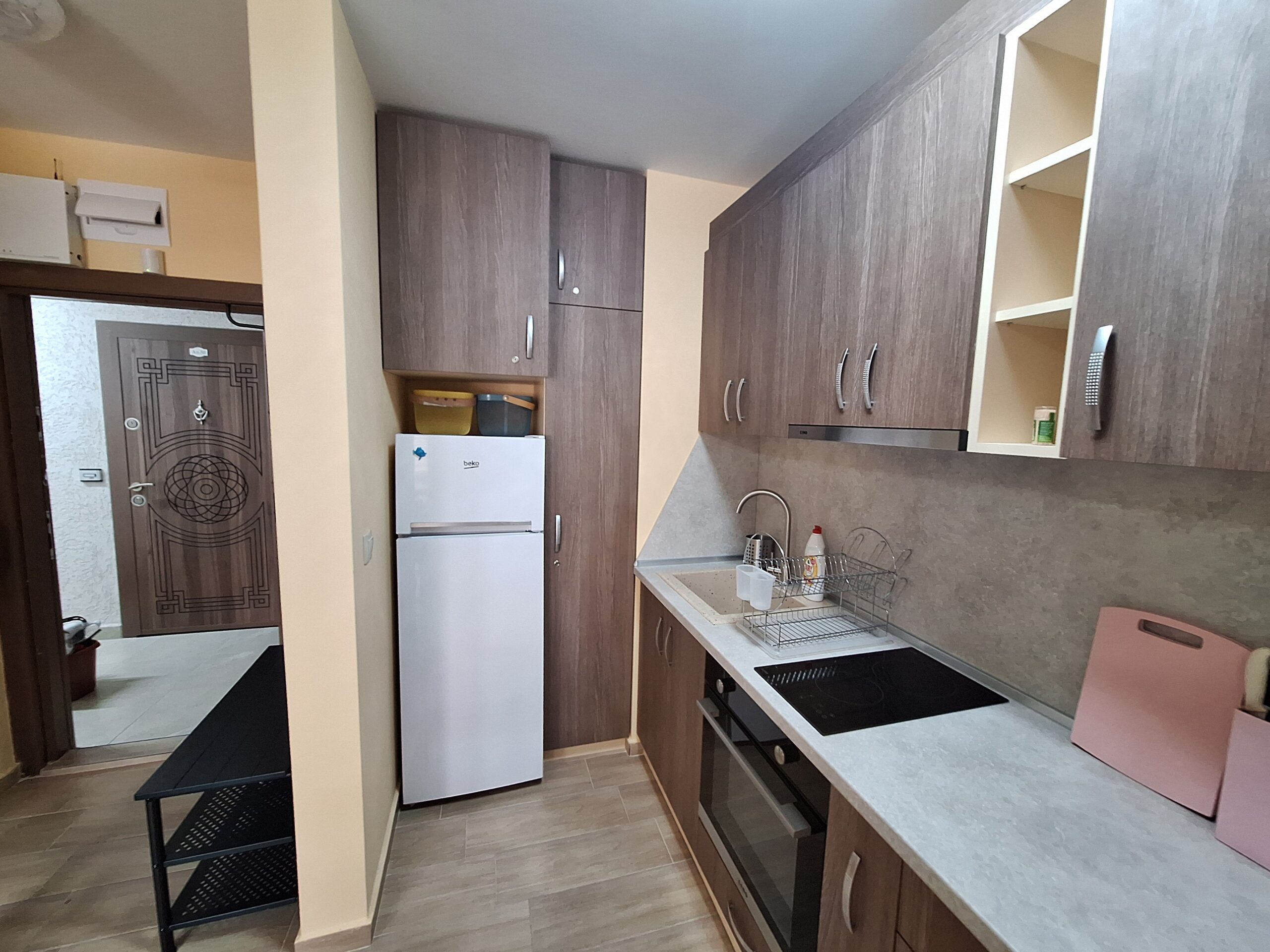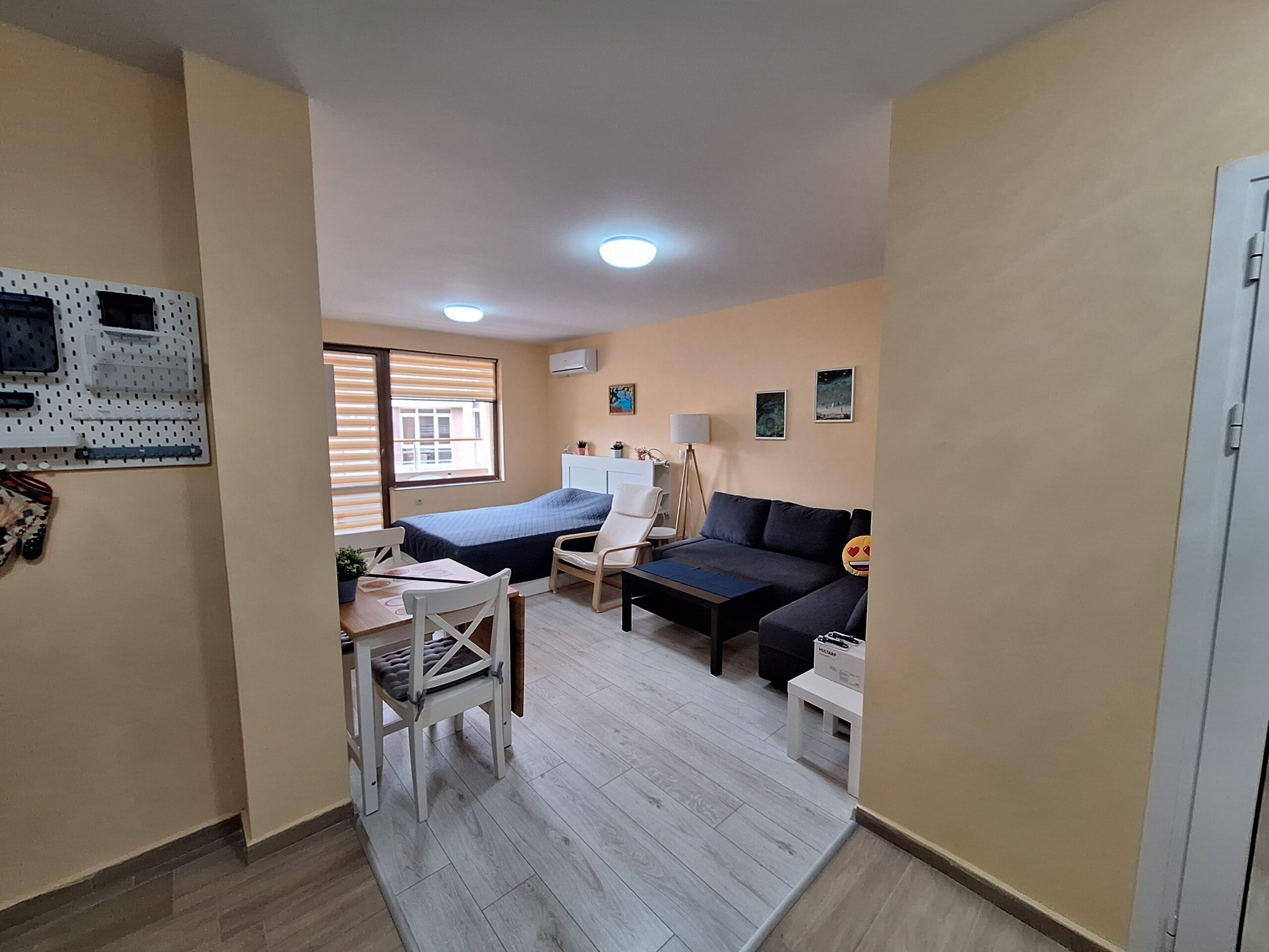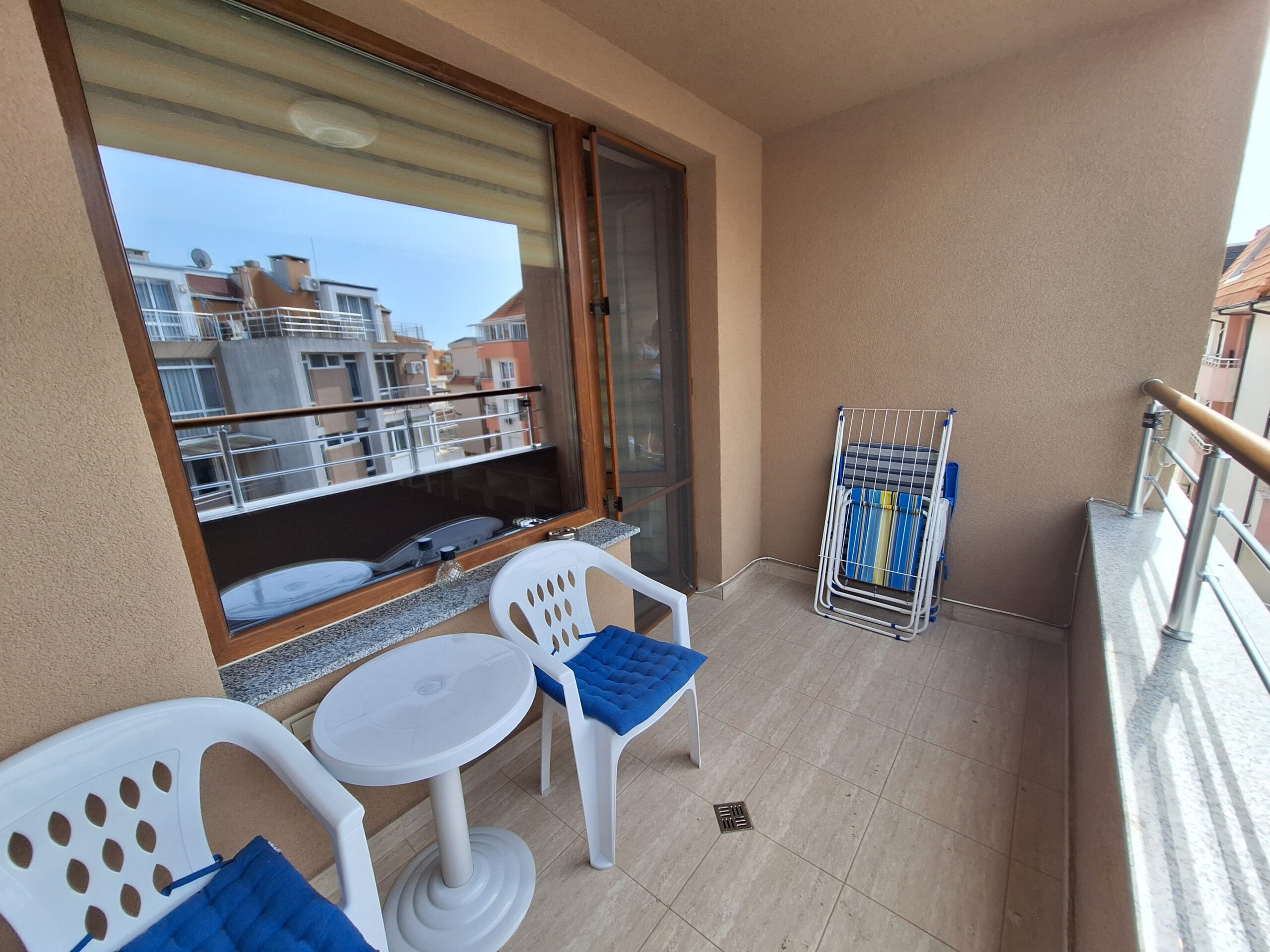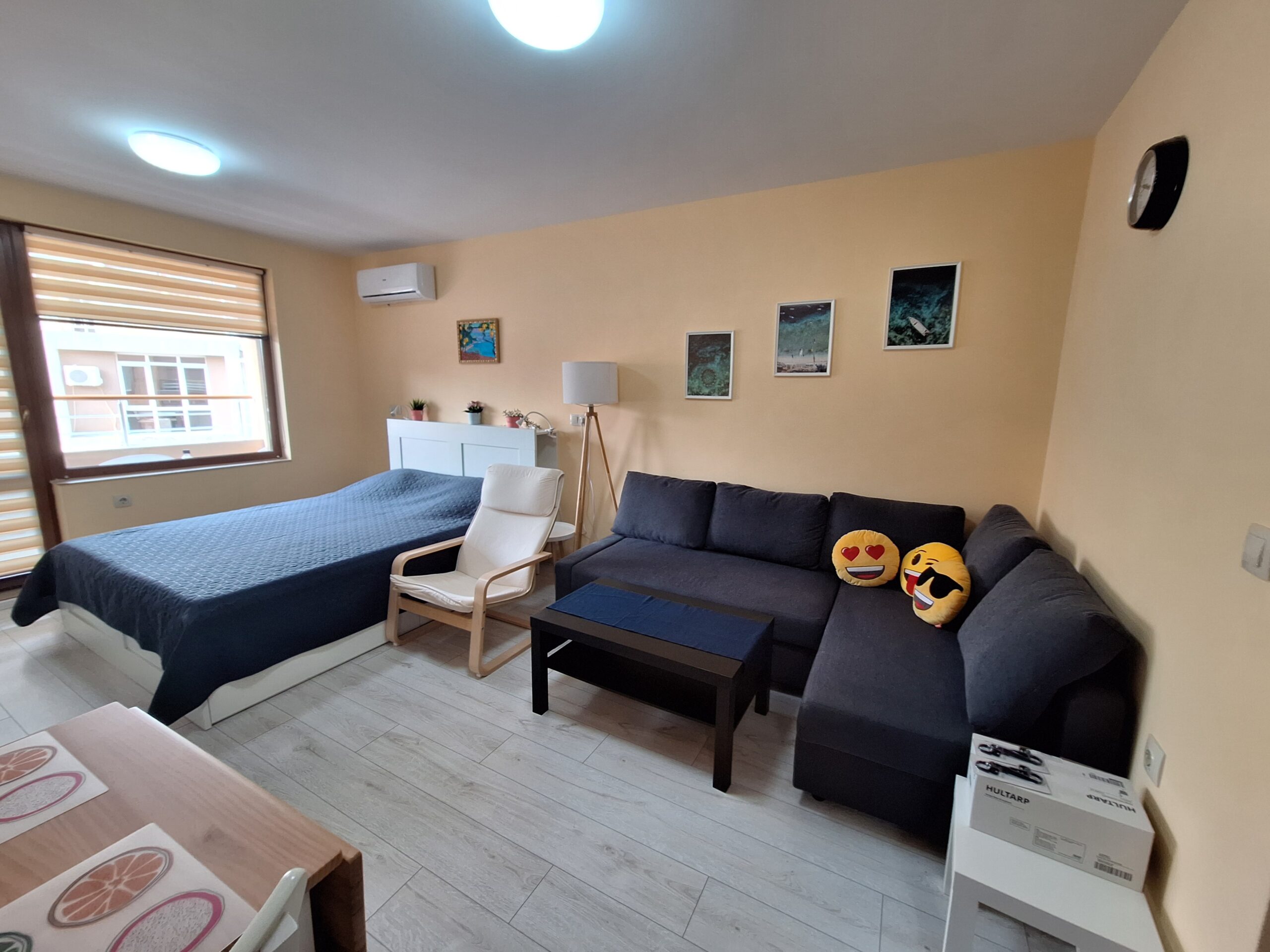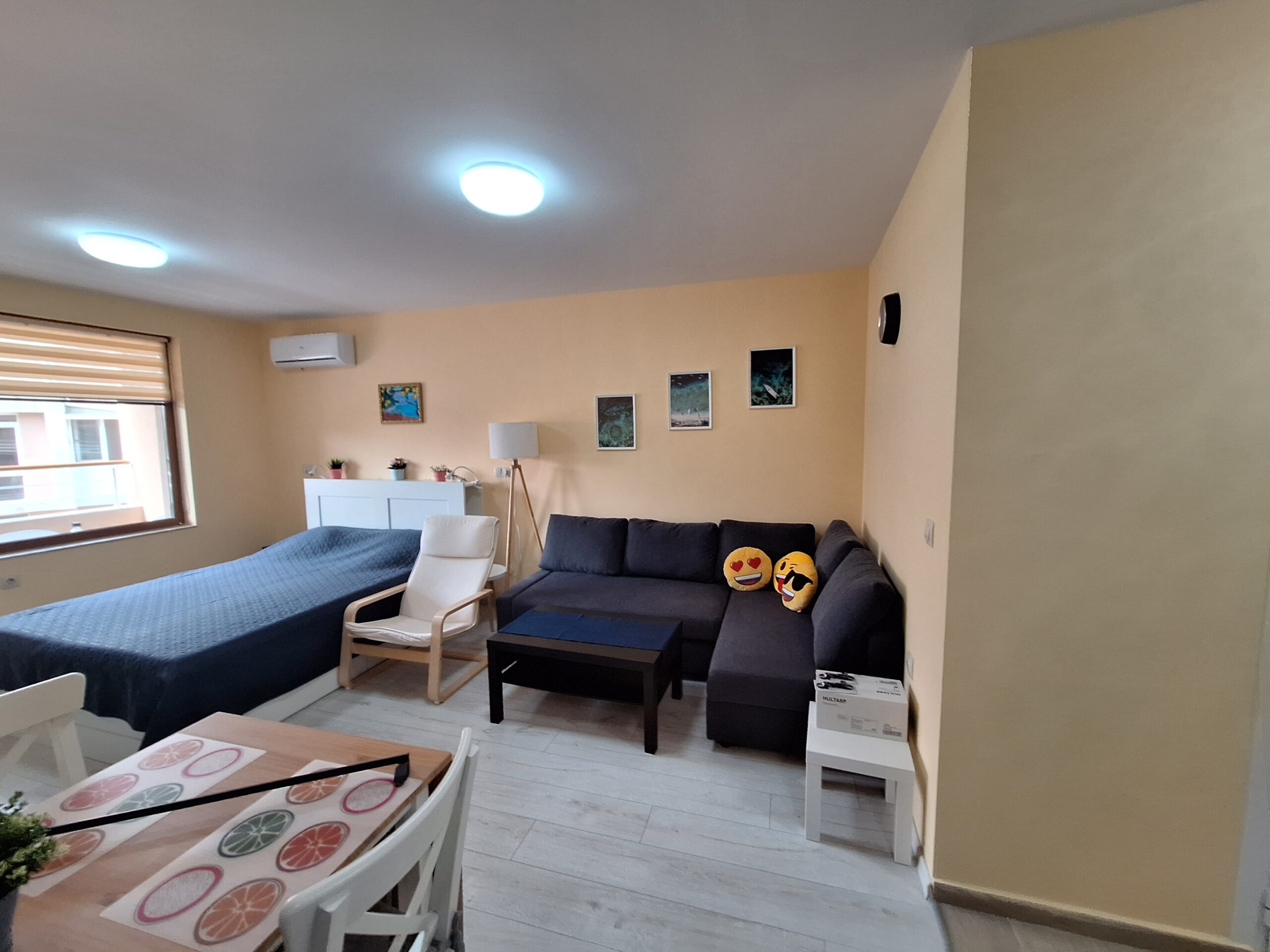 Студиото предлага всички удобства за вашият конфорт и приятно изкарване на лятната почивка. Оборудвано е скухня, която предлага двоен котло, фурна, кафе машина, чайник, микровълнова печка, тостер, пълен комплект от готварски принадлежност и посуда, хладилник с фризер. Имота е разположен на 4-ти жилищен етаж с юго-зточно изложение, просторен балкон, двойно легло и разтегателен диван. Предлага три спални места, най удобно е за 2-ма възрастни и дете.