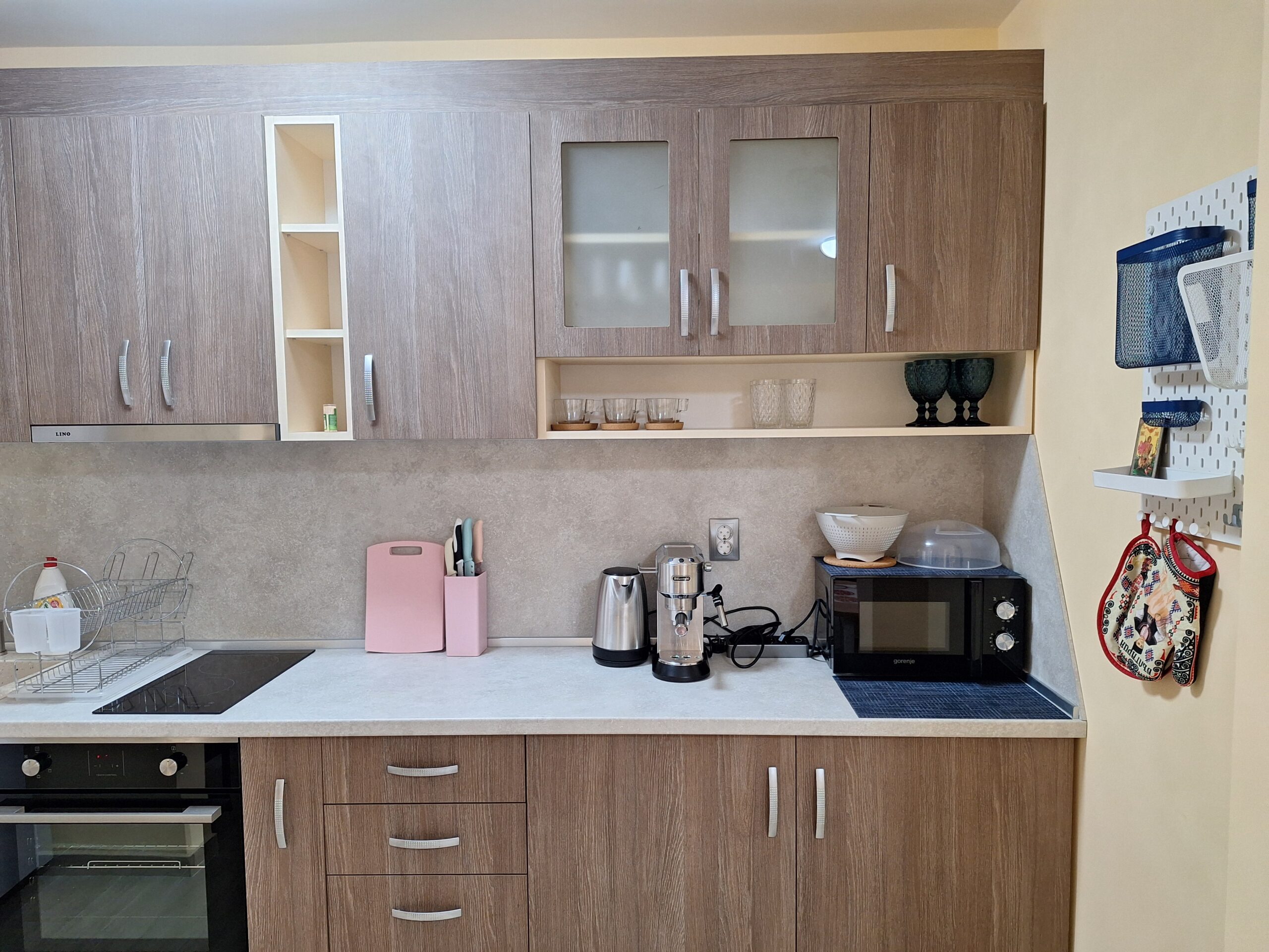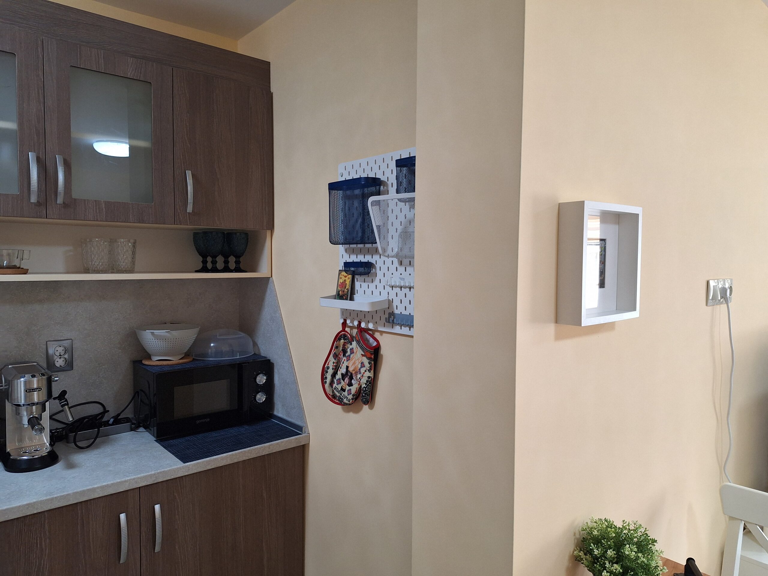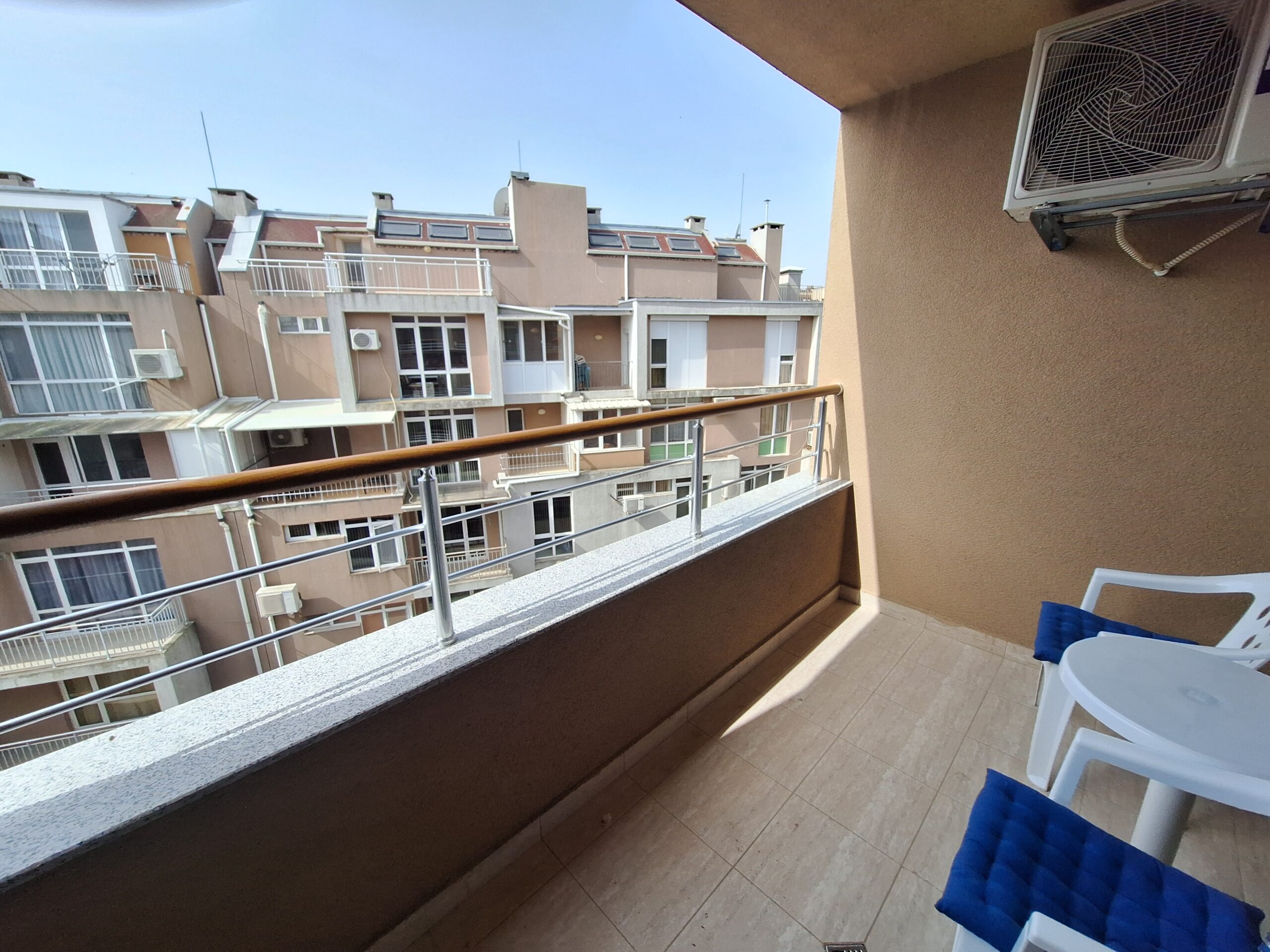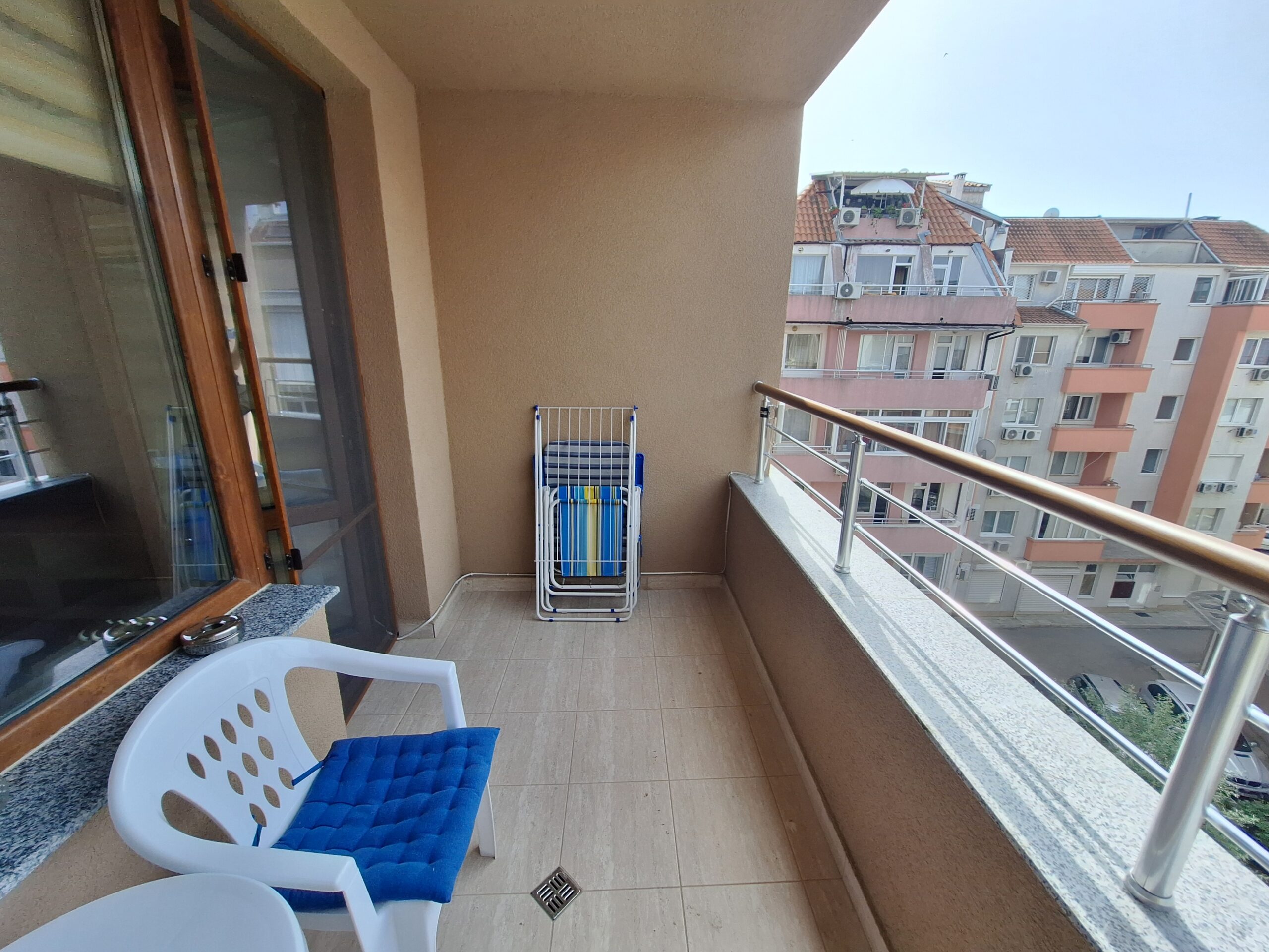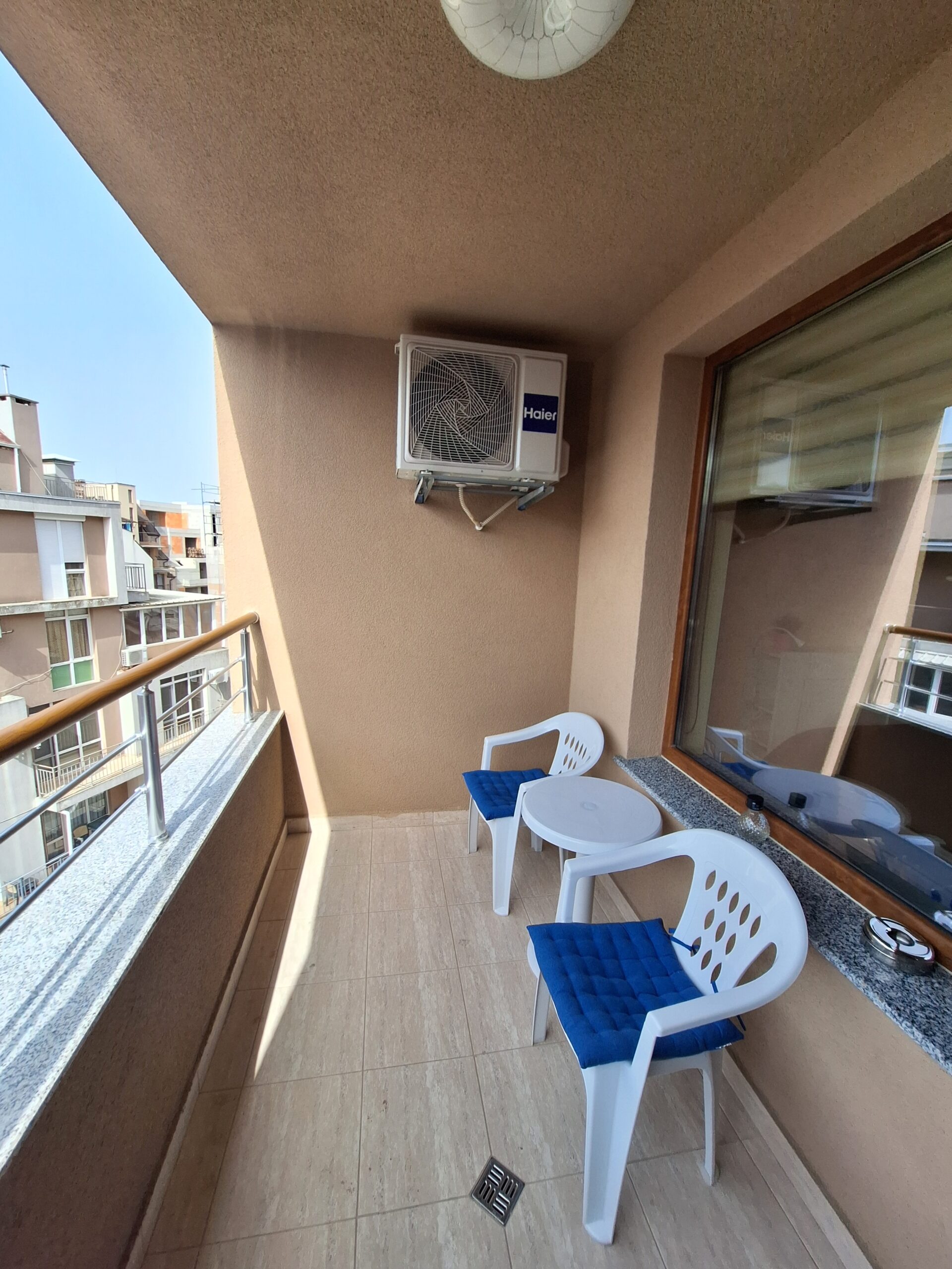 Студиото предлага всички удобства за вашият конфорт и приятно изкарване на лятната почивка. Оборудвано е скухня, която предлага двоен котло, фурна, кафе машина, чайник, микровълнова печка, тостер, пълен комплект от готварски принадлежност и посуда, хладилник с фризер. Имота е разположен на 4-ти жилищен етаж с юго-зточно изложение, просторен балкон, двойно легло и разтегателен диван. Предлага три спални места, най удобно е за 2-ма възрастни и дете.