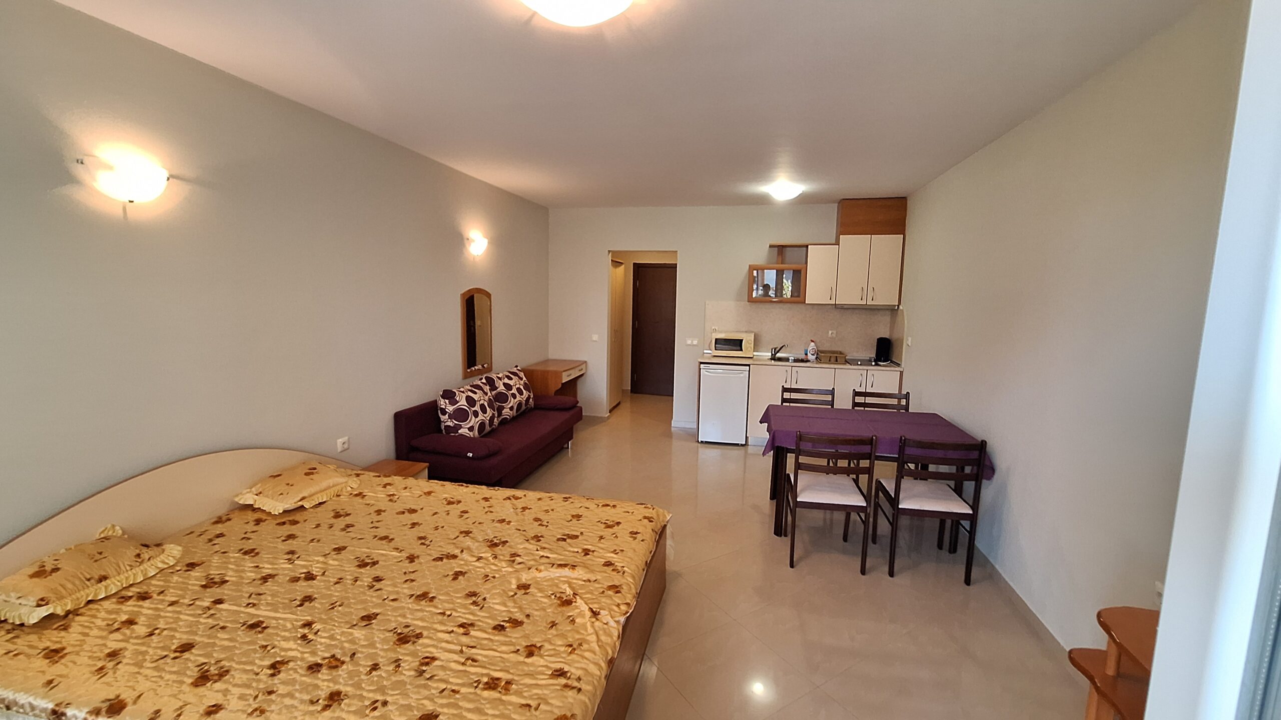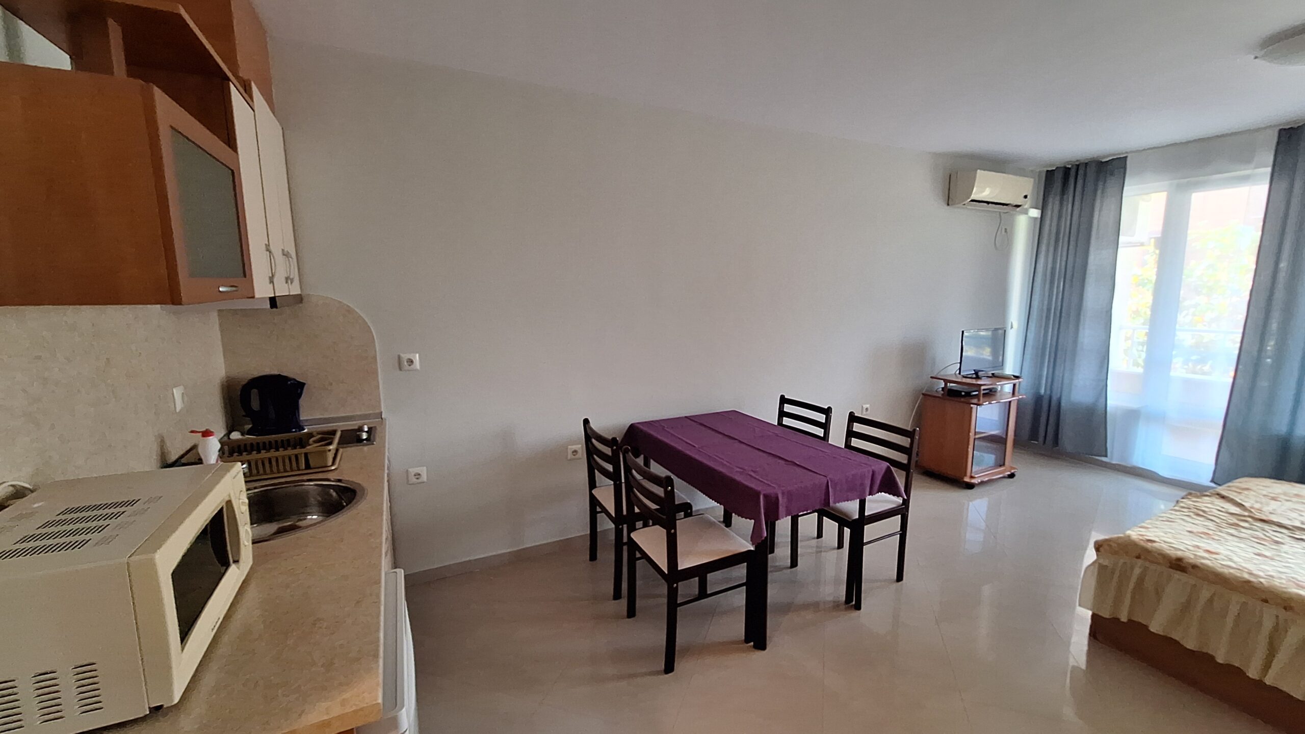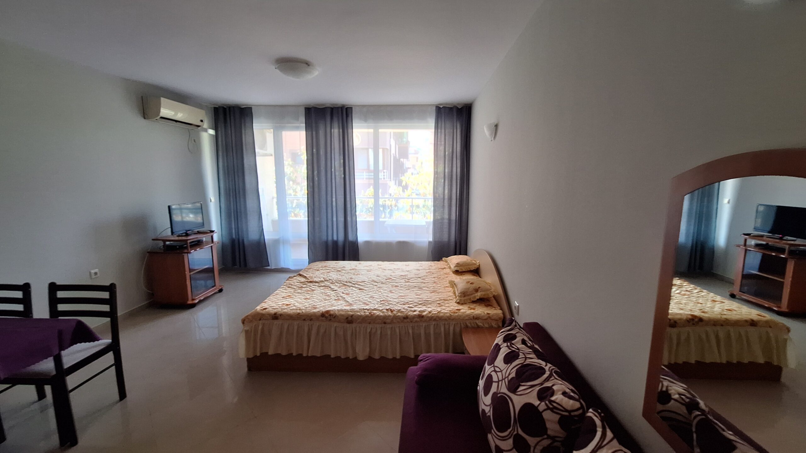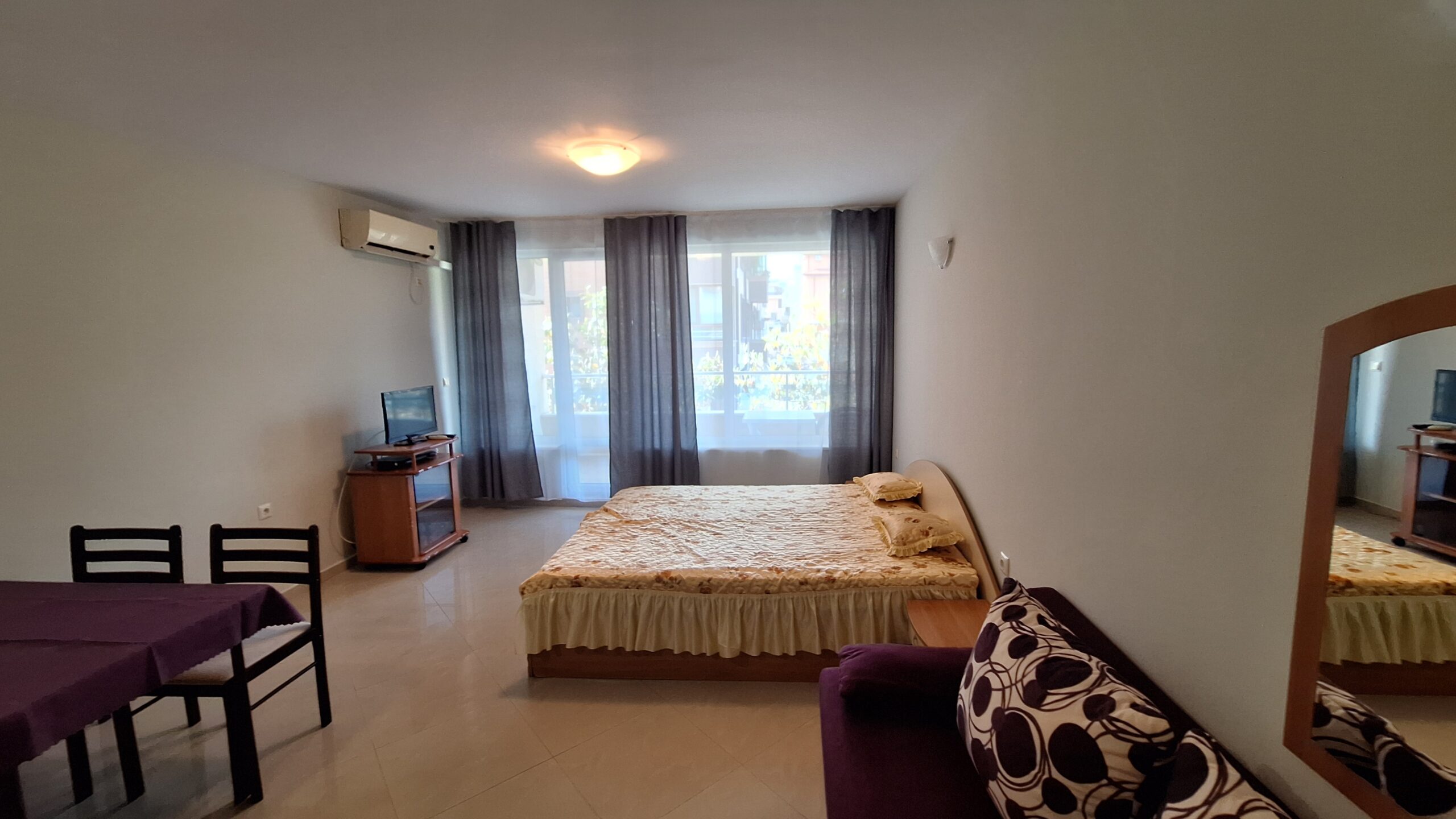 Просторно Студио в близост до санаториума за калолечение, на около 120 метра от плажната ивица, в близост до комплеклс „Роуз Гардън“. Имота е подходящ за 2 възръстни и дете, има оборудвана кухня, просторен балкон, спалня, разтегателен диван. Апартамента е светъл с южно изложение, намира се на първи жилищен етаж над партерен, в близост до сградата има бистро, няколко магазина, ресторанти, пазарче за плодове и зеленчуци, 2 общински паркинга, удобно е за средно дълъг престой.