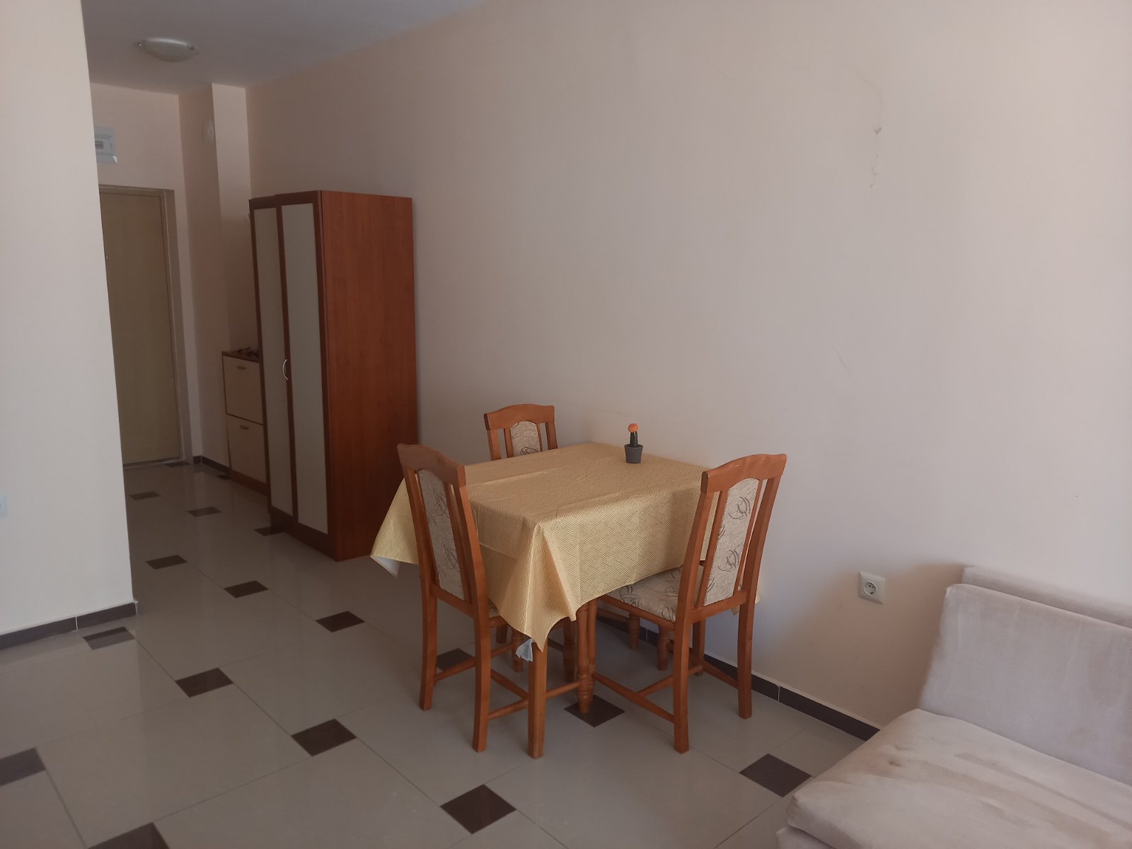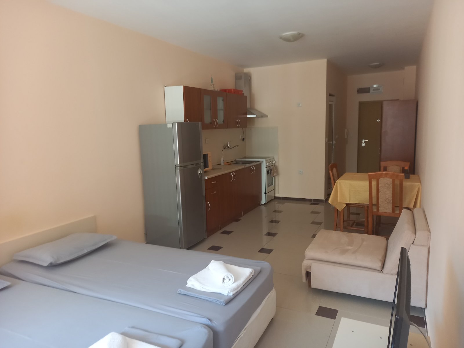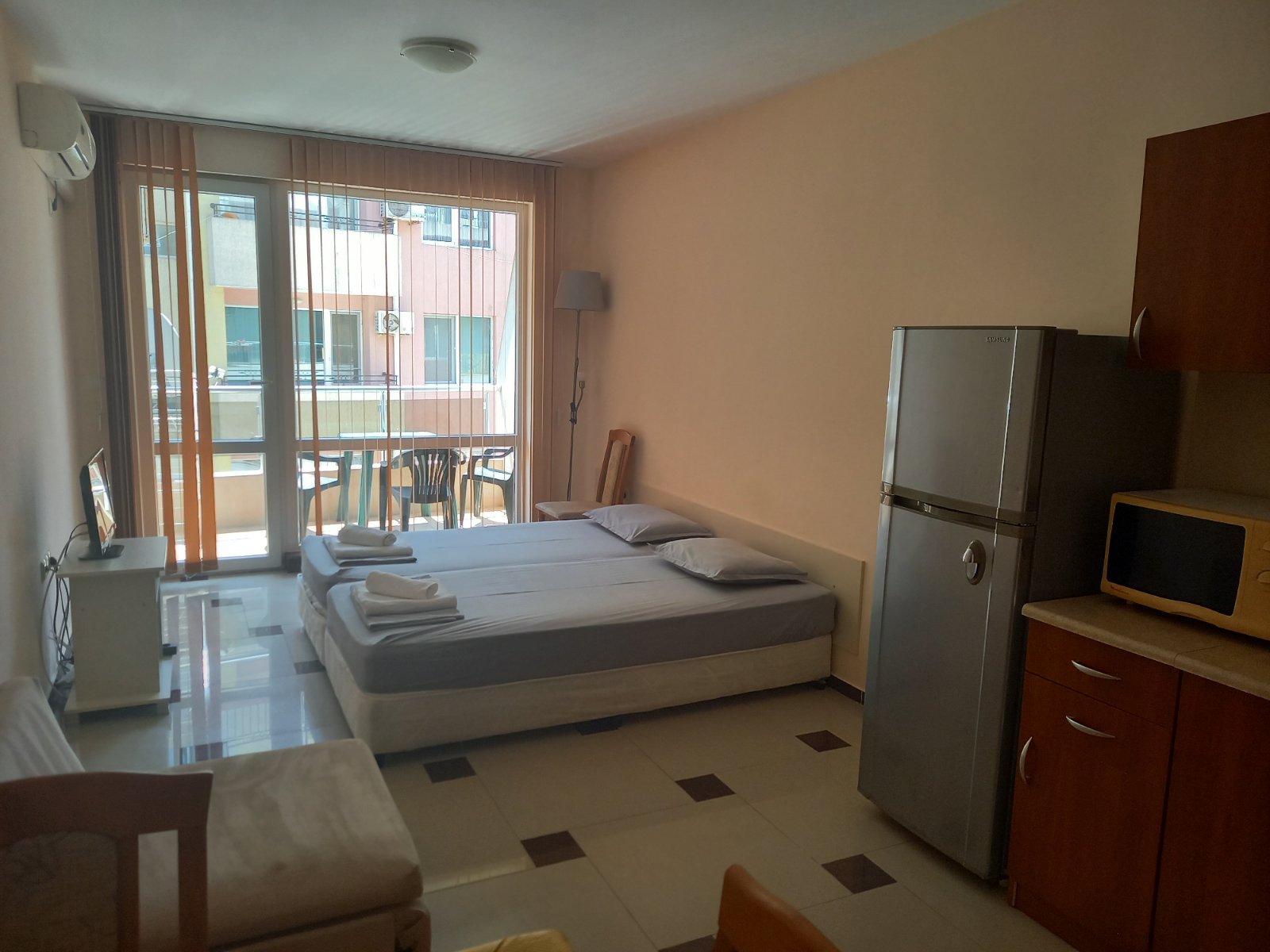 Студио на ул. България на 3-ти жилищен етаж, предлагащо удобства за двама. Апартамента е с оборудвана кухня, две единични легла, разтегателен фотьойл за дете до 10-12 години, балкон, санитарен възел и коридор. Намира се в сграда на ул. България №16, в близост до сладкарница „Захаро“, На около 350 метра до централната улица и на около 250 метра до плажа. В близост до сградата има няколко супермаркета, множество ресторанти, автогарата е на около 250 метра, безплатен паркинг на около 80 метра и няколко общински платени паркинга.