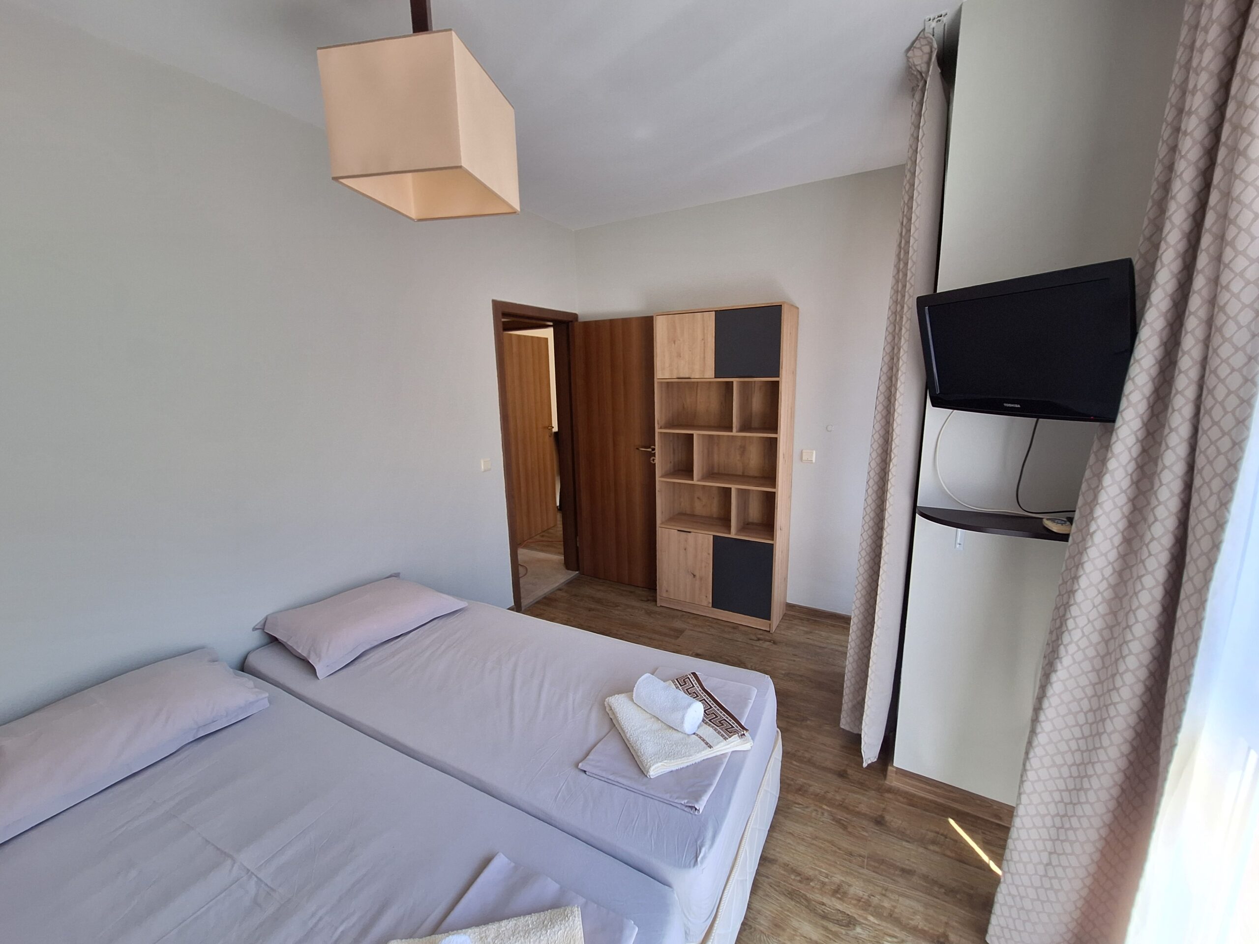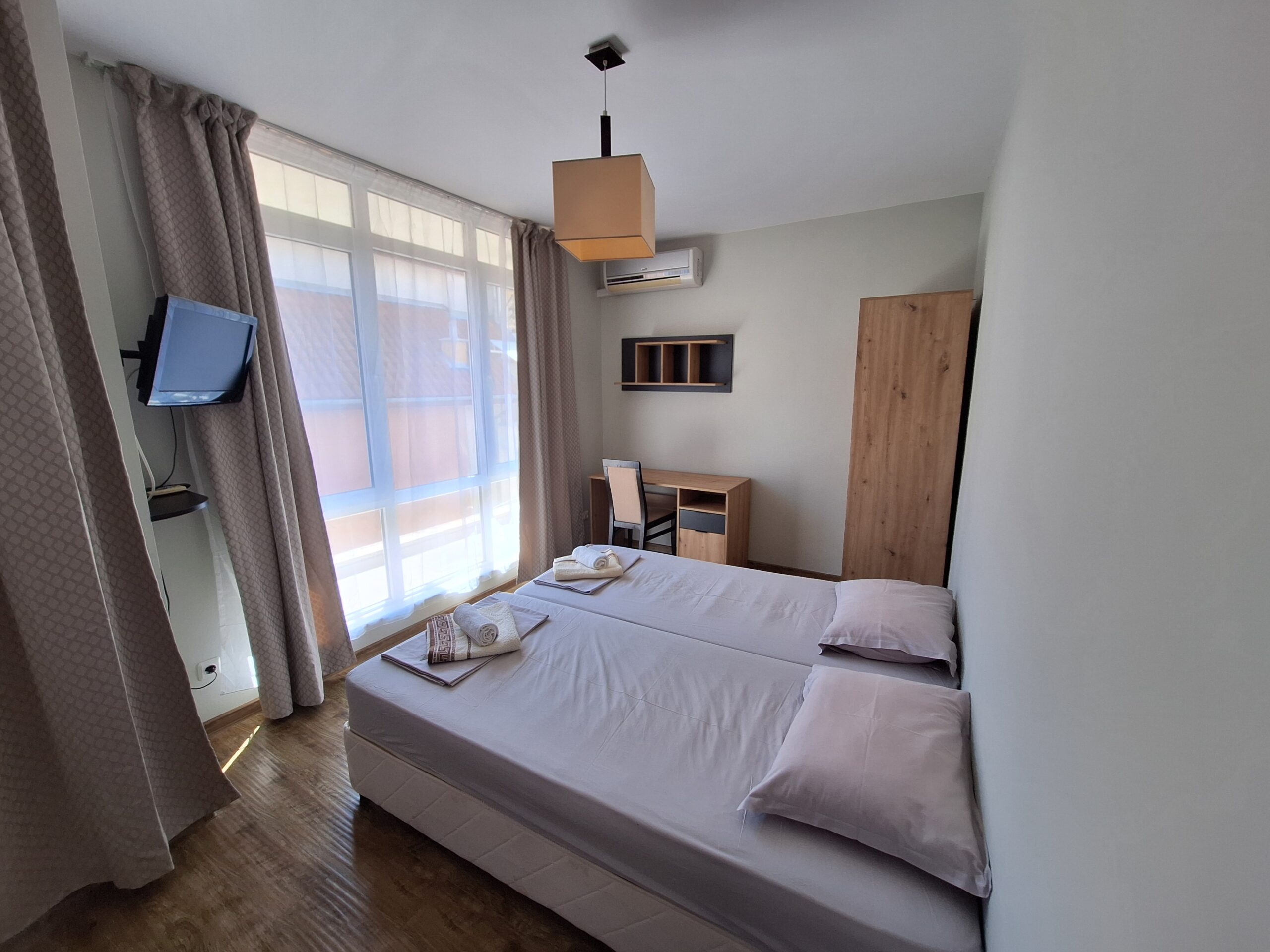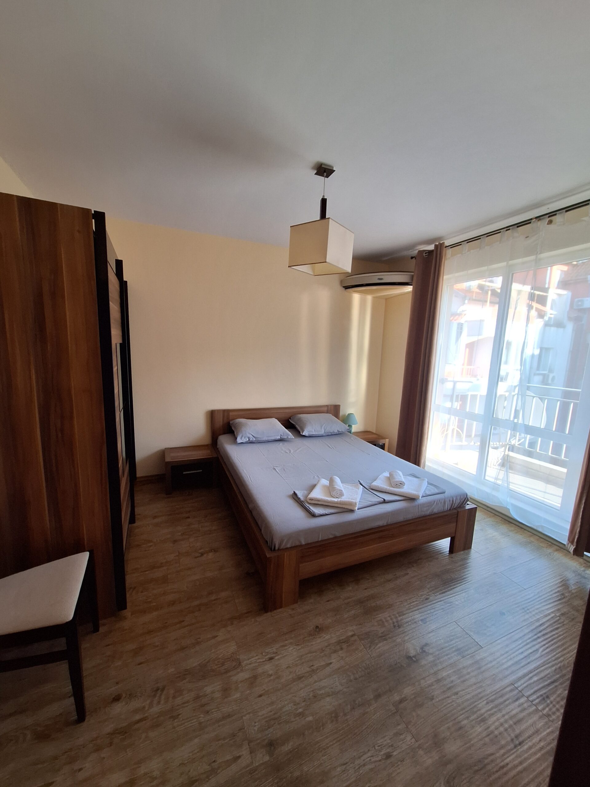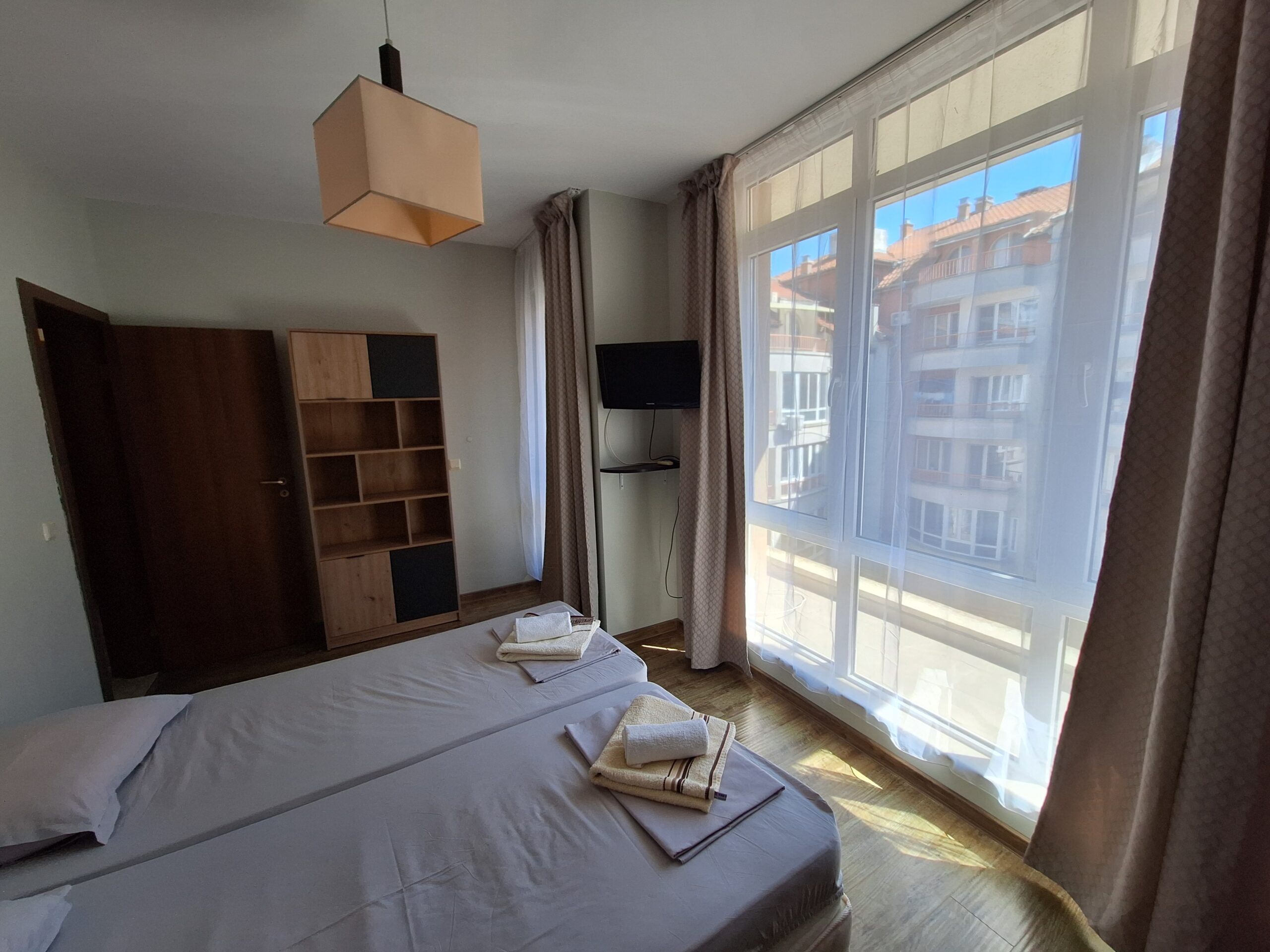 Просторен тристаен Апартамент на ул. Панайот Хитов и ул. Македония, имота е разположен на 3-ти жилищен етаж, разполага с две спални, всекидневна с кухня, два санитарни възела, мокро помещение, 2 балкона и просторна тераса. Имота е много удобен за големи семейства, има всички удобства за приятна почивка. Сградата в която се намира Апартамента е на гърба на болницата в Поморие, дистанцията до най близкия плаж е около 700 метра, центъра е на близо, южната крайбрежна алея е на около 300 метра.