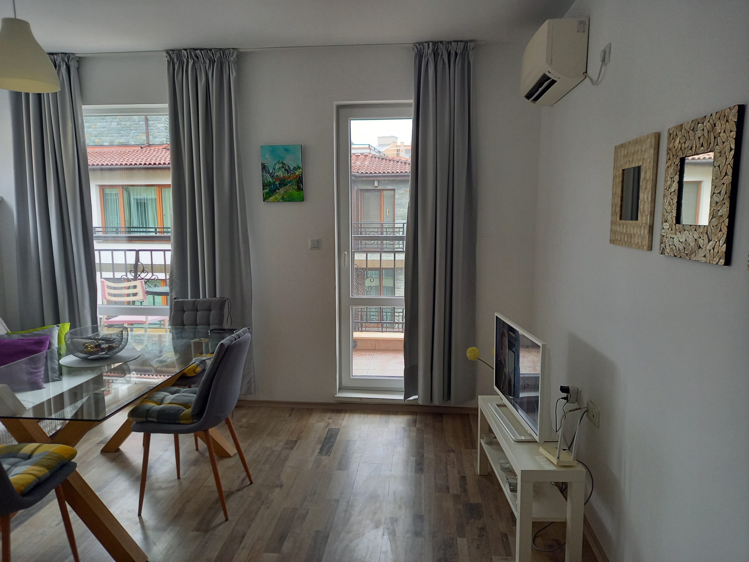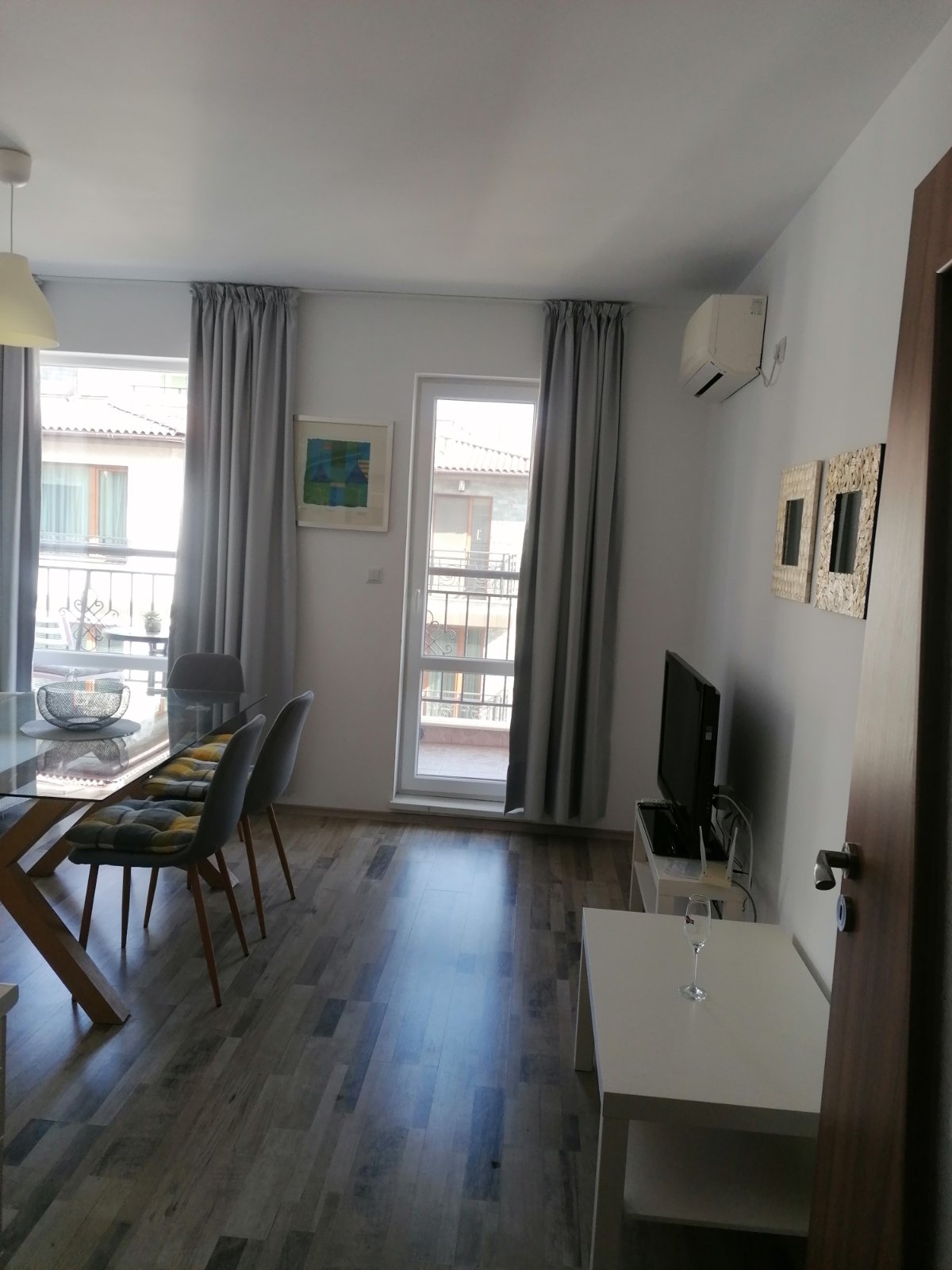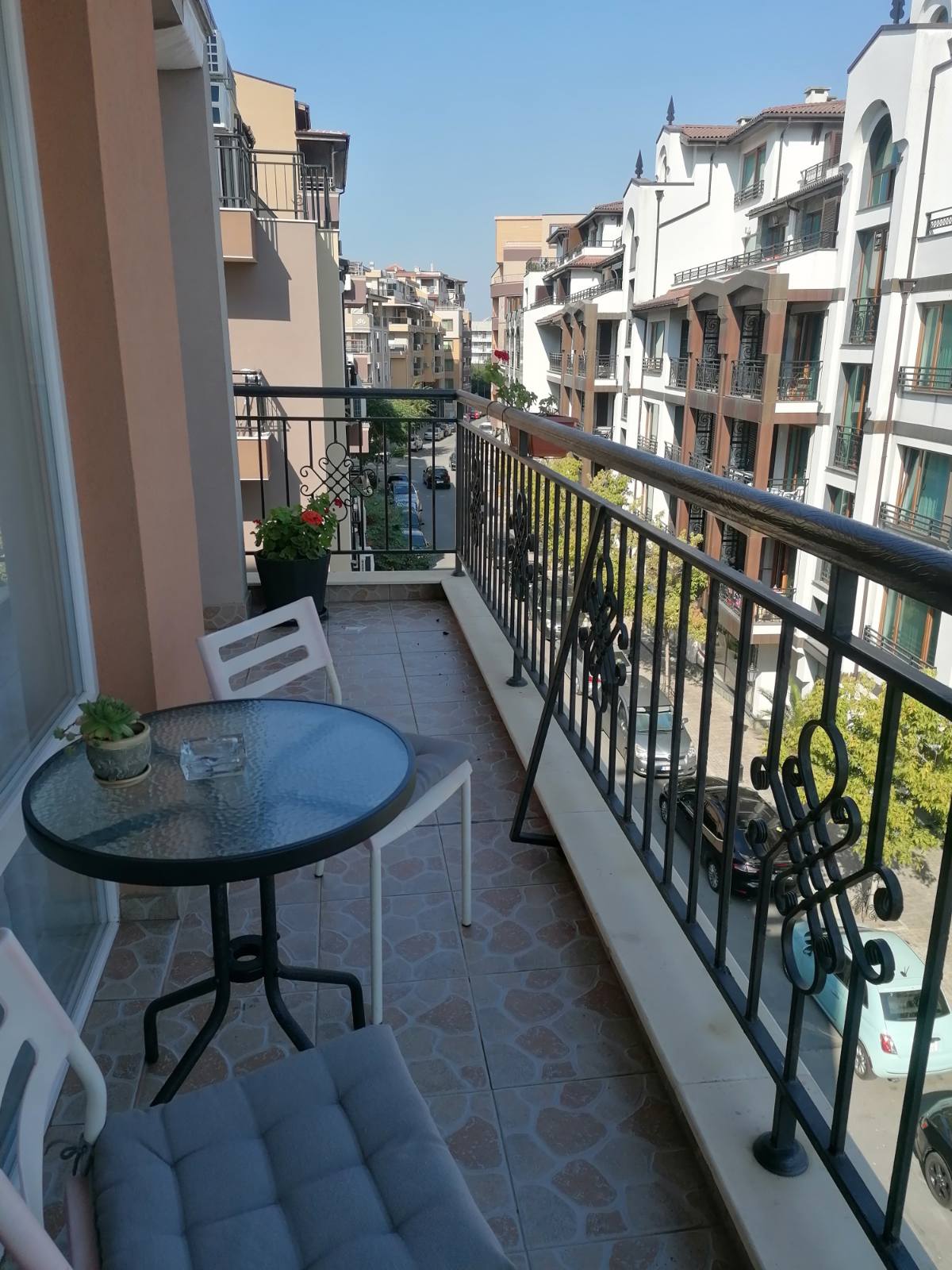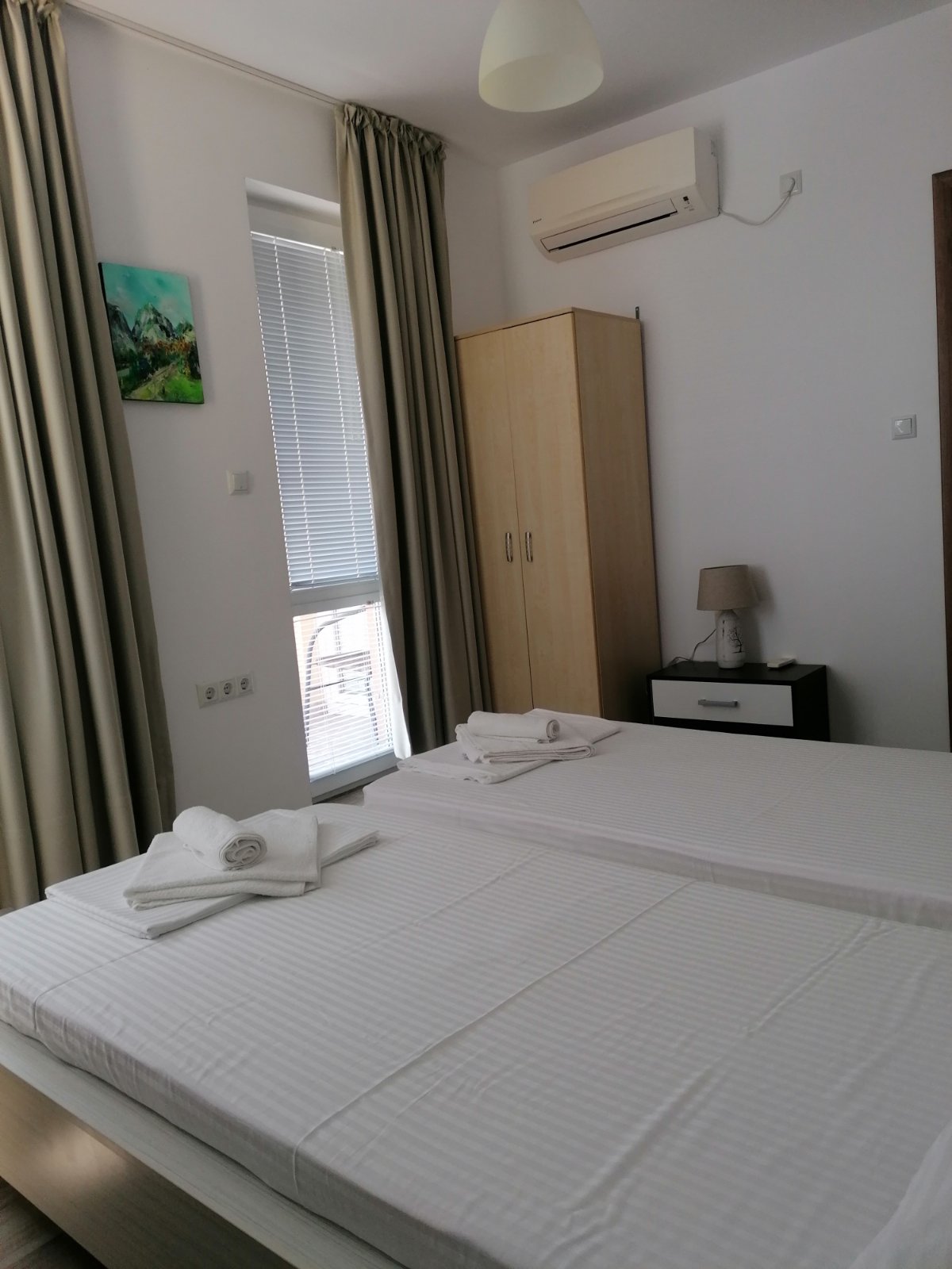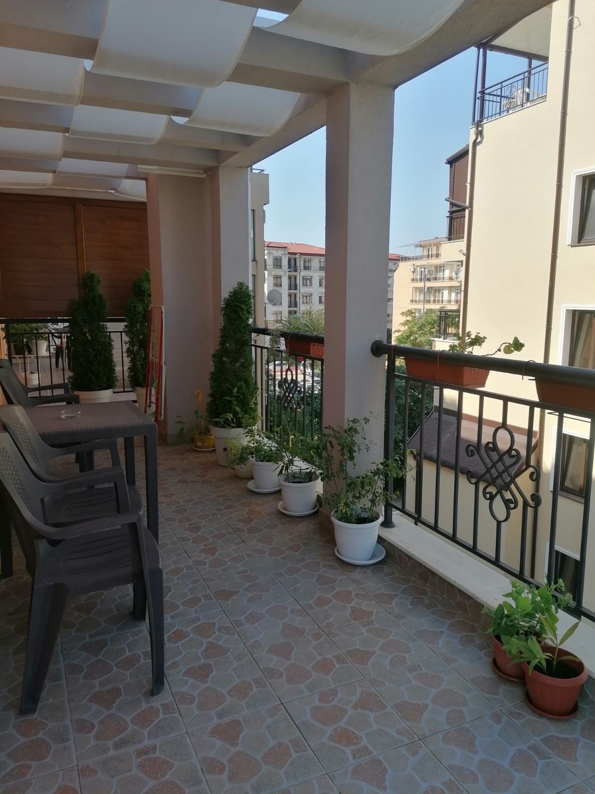 Тристаен апартаменто до входа на плажа с прекрасна гледка към морето. Апартамента е разположен на трети жилищен етаж с изложение на изток, север и запад (на три страни) предлага две спални, всекидневна с кухненски бокс, санитарен възел, балкон на изток към плажа, огромна тераса на север и запад. Сградата е само на 40 метра от входа на плаж, в съседство с комплекс „Роуз Гардън“, района е привлекателен с избора на плажове, калолечение и места за хранене.